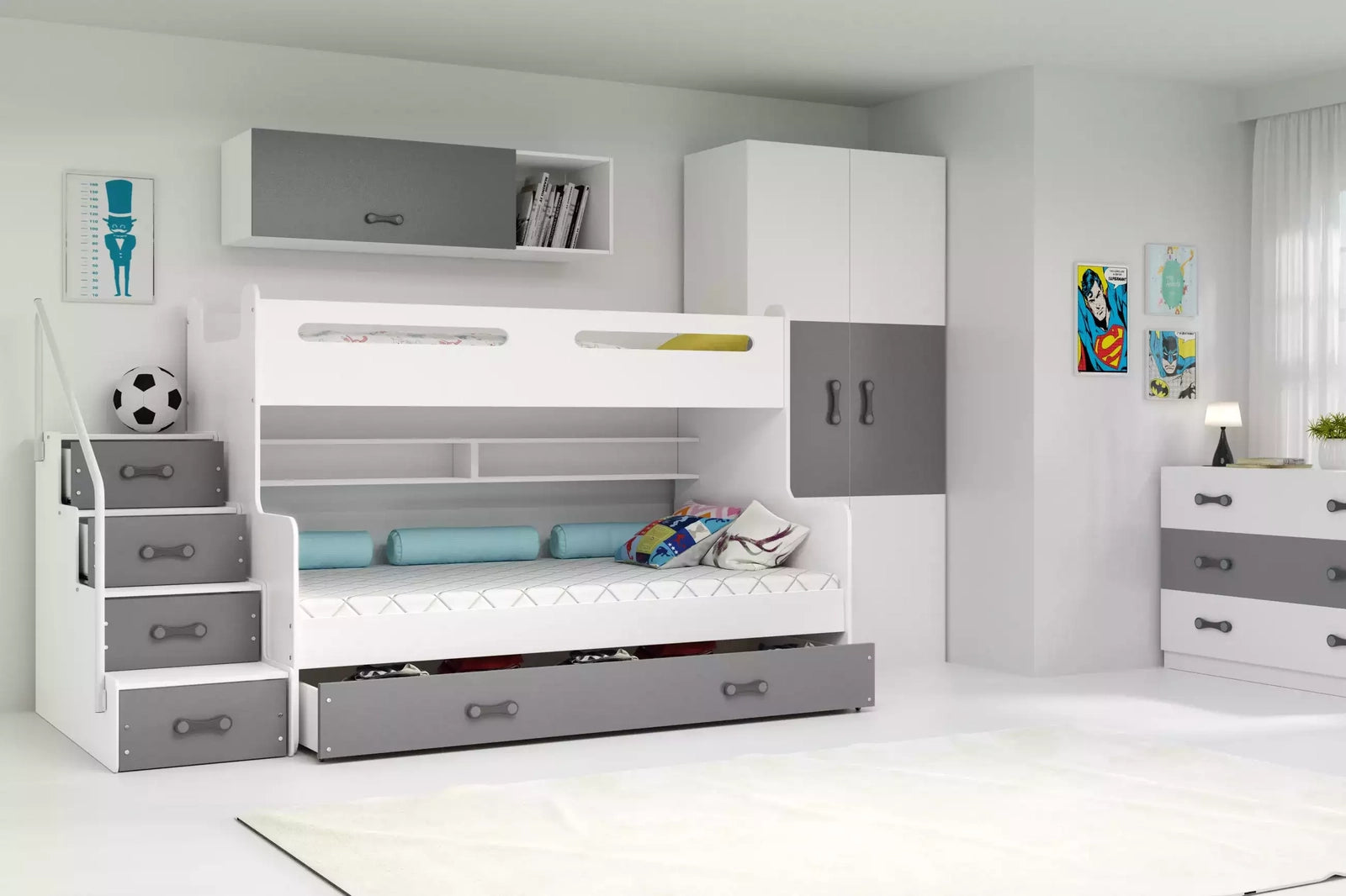 Dviaukštė jaunuolių lova MAX 3, 120x200 cm, pilka, su čiužiniais ir stalčiumi – vaizdas 6