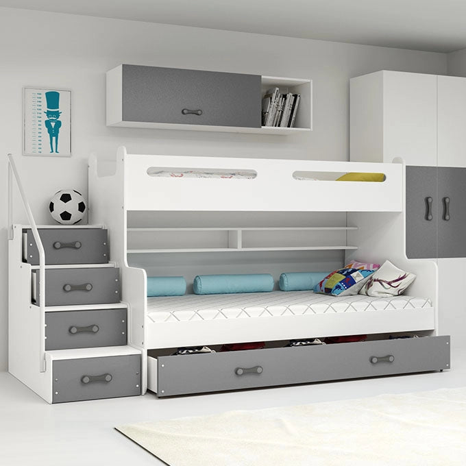 Dviaukštė jaunuolių lova MAX 3, 120x200 cm, pilka, su čiužiniais ir stalčiumi – pagrindinis vaizdas