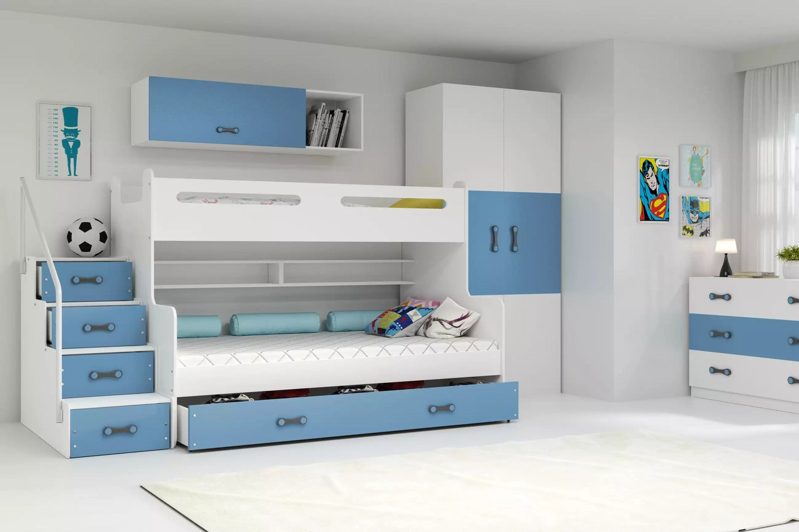 Dviaukštė jaunuolių lova MAX 3, 120x200 cm, mėlyna, su čiužiniais ir stalčiumi – vaizdas 5