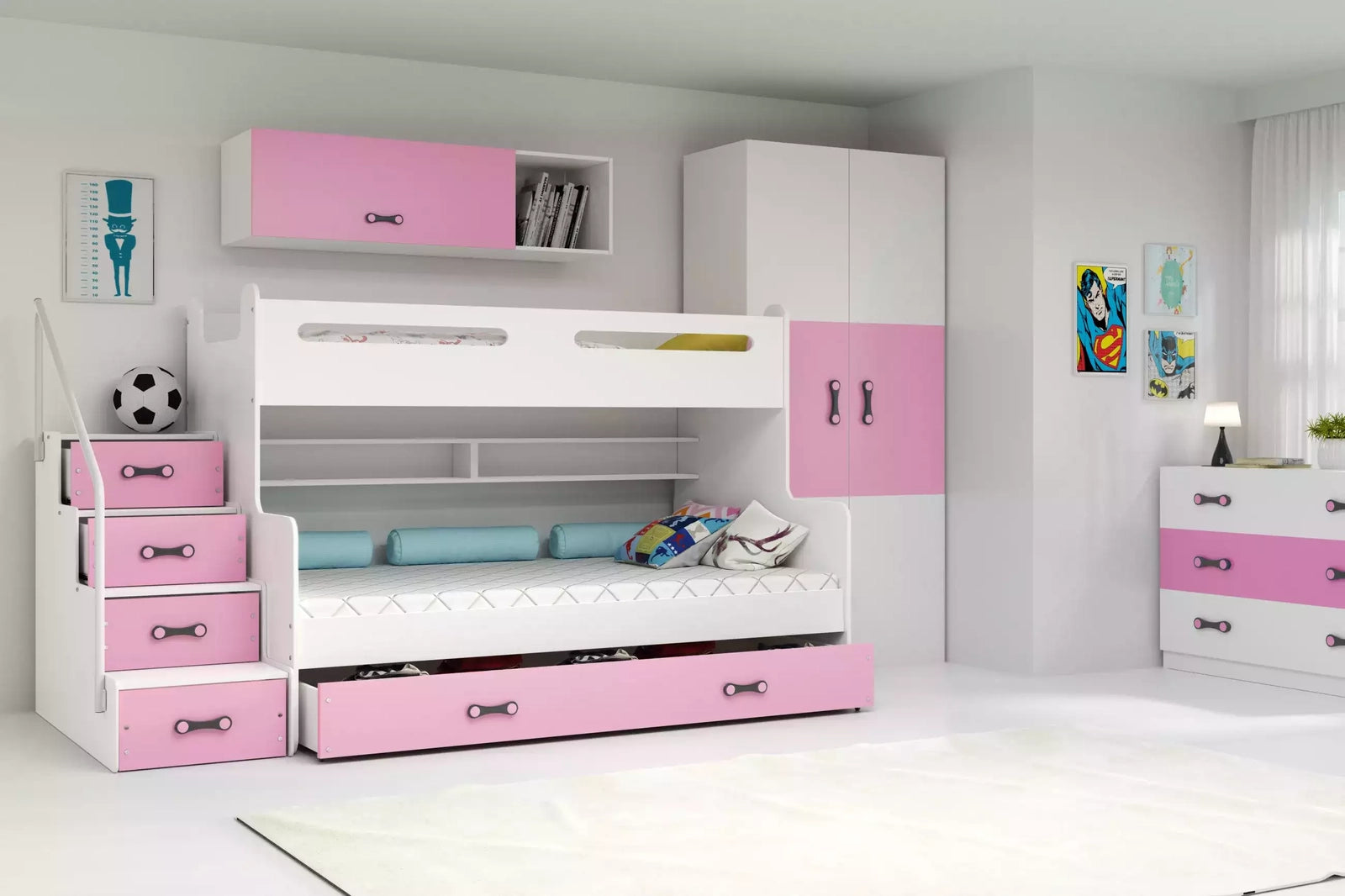 Dviaukštė jaunuolių lova MAX 3, 120x200 cm, rožinė, su čiužiniais ir stalčiumi – vaizdas 4