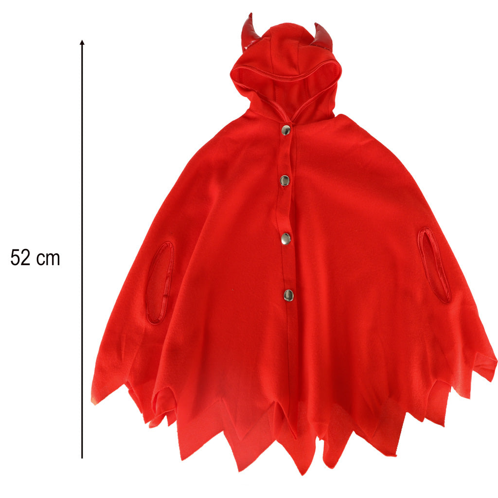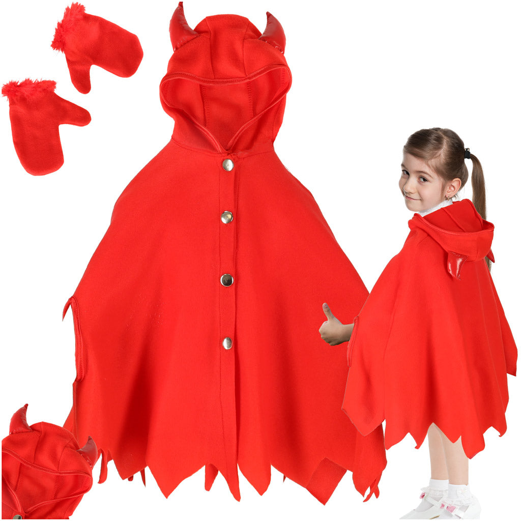 Šis velnio kostiumas puikiai tinka kostiumų vakarėliams, Helovinui ar teminiams vakarėliams. Komplektą sudaro raudonas apsiaustas su gobtuvu ir ragais bei raudonos pirštinės. Tinka 100–110 cm ūgio vaikams.