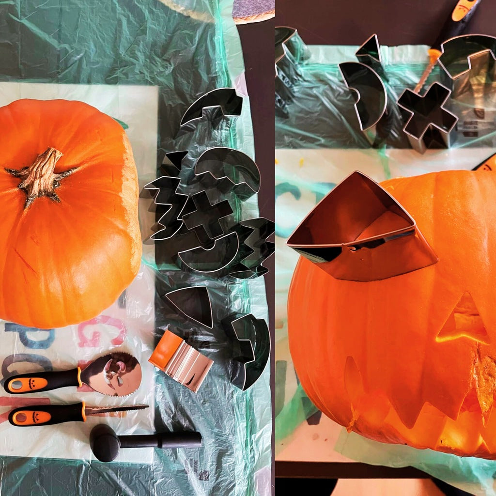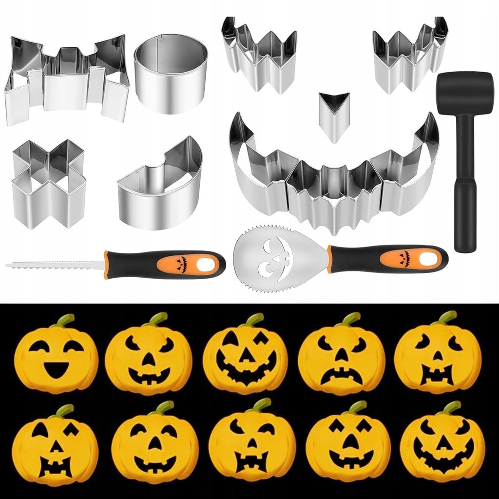 Didelis rinkinys, kurį sudaro iki 10 įvairių formų pjaustytuvų, tvirtas guminis plaktukas, šaukštas su Helovino veidu ir drožybos peilis.