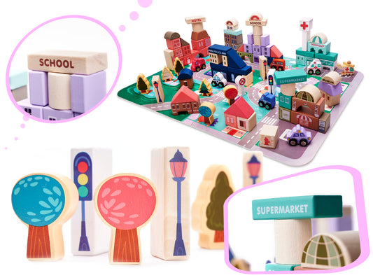 Edukaciniai mediniai miesto dėlionės blokai 135el.