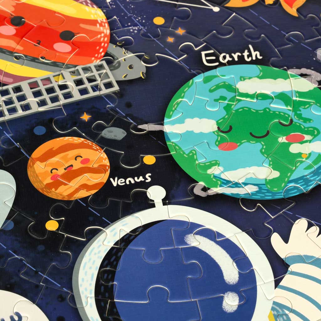 Dėlionės schemoje pavaizduota supaprastinta Saulės sistemos schema, t. y. Saulė, visos planetos, Tarptautinė kosminė stotis ir astronautas! Jis sukurtas taip, kad džiugintų akį ir skatintų mažylį žaisti, o naudojamos spalvos yra sodrios ir gražios.