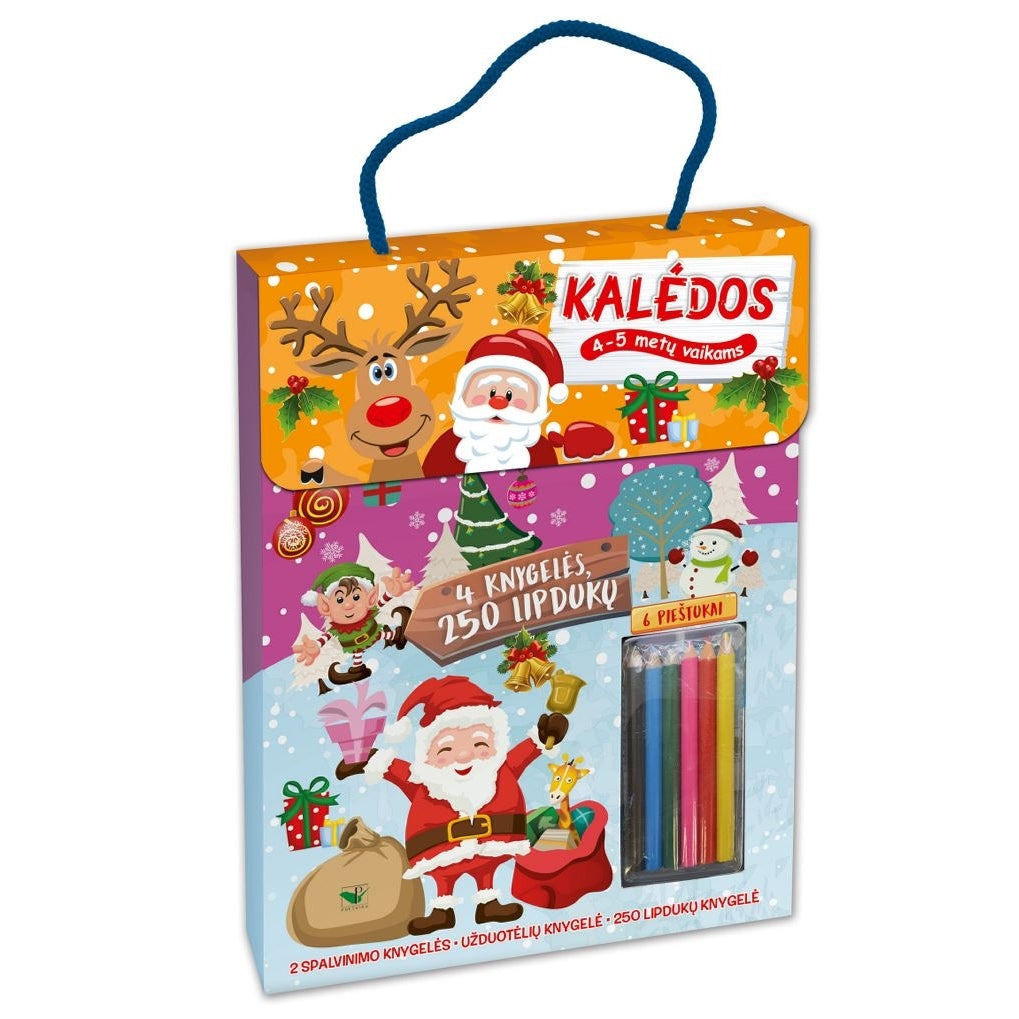 Šį kalėdinį rinkinį sudaro 4 knygelės: užduočių knygelė (16 p.), dvi spalvinimo knygelės (po 16 p.), 250 lipdukų knygelė (4 lipdukų p.) ir 6 spalvoti pieštukai.