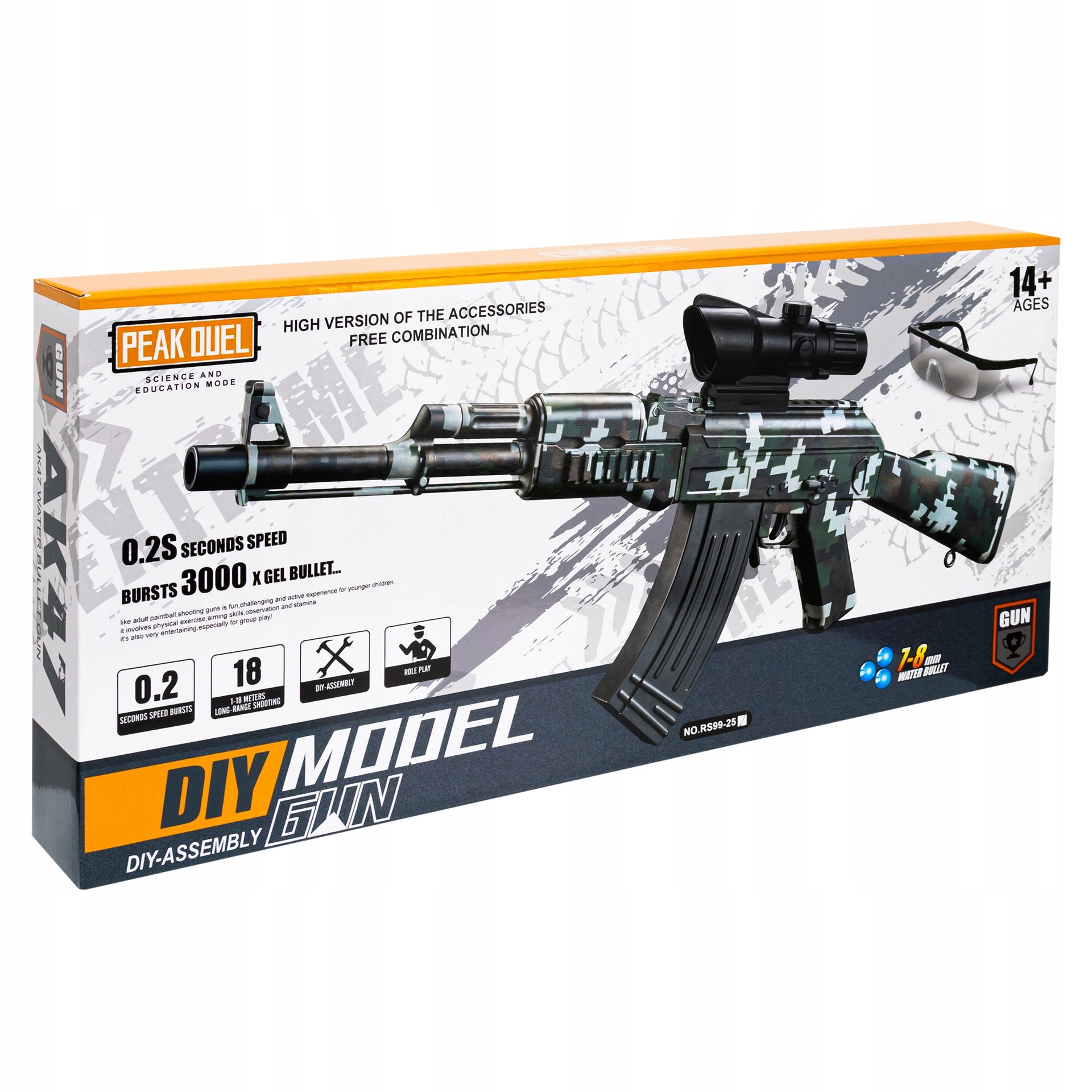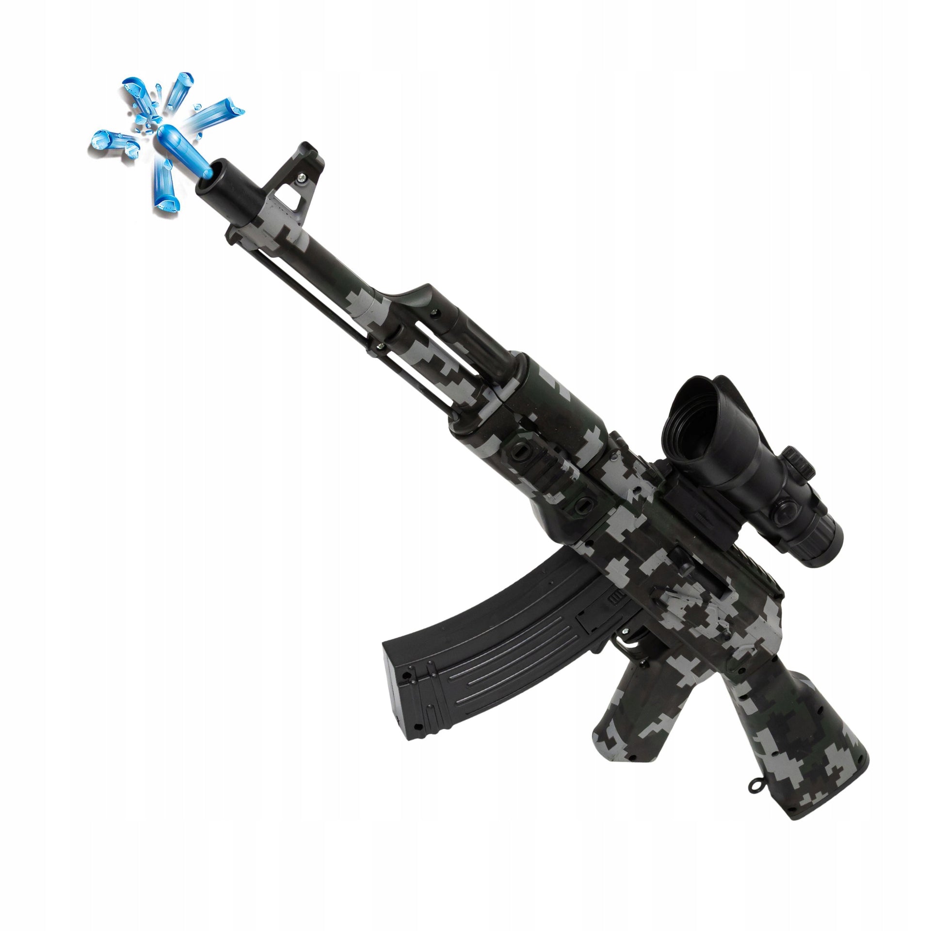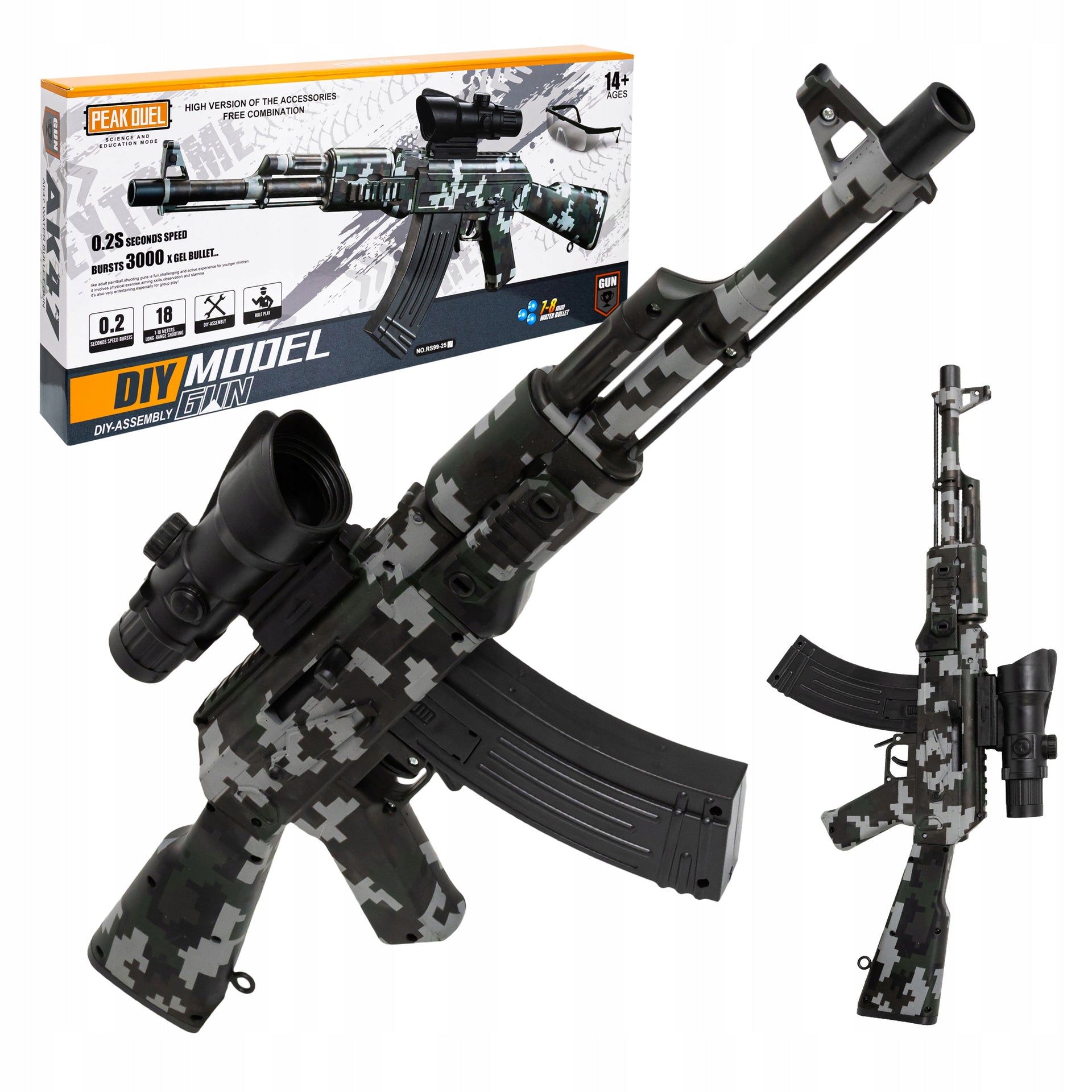 Šis automatinis žaislinis karabinas pasižymi aukšta kokybe ir ilgaamžiškumu, pagamintas iš lengvo ir patvaraus ABS plastiko. Keturios svarbiausios funkcijos leidžia pasirinkti tiek serijinį, tiek pavienį šaudymą, todėl žaidimas tampa dar įdomesnis ir dinamiškesnis.