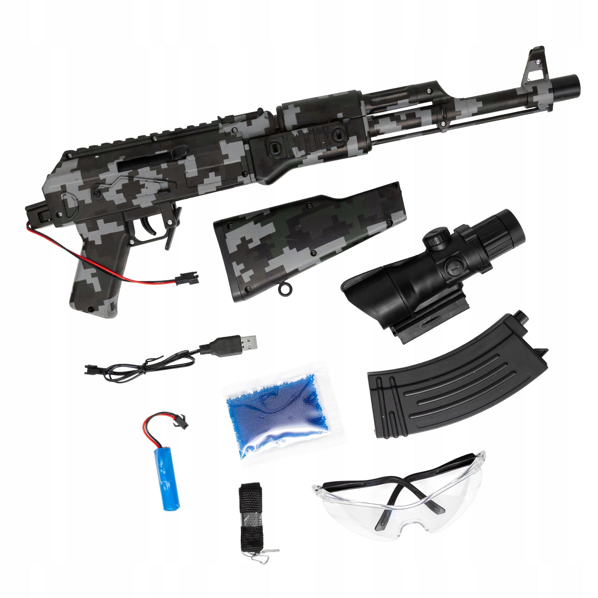 Komplektą sudaro apšvietimu ir lazeriu aprūpintas taikiklis, slopintuvas, apsauginiai akiniai ir pakankamas gelinių kulkų kiekis (apie 8000 vnt).