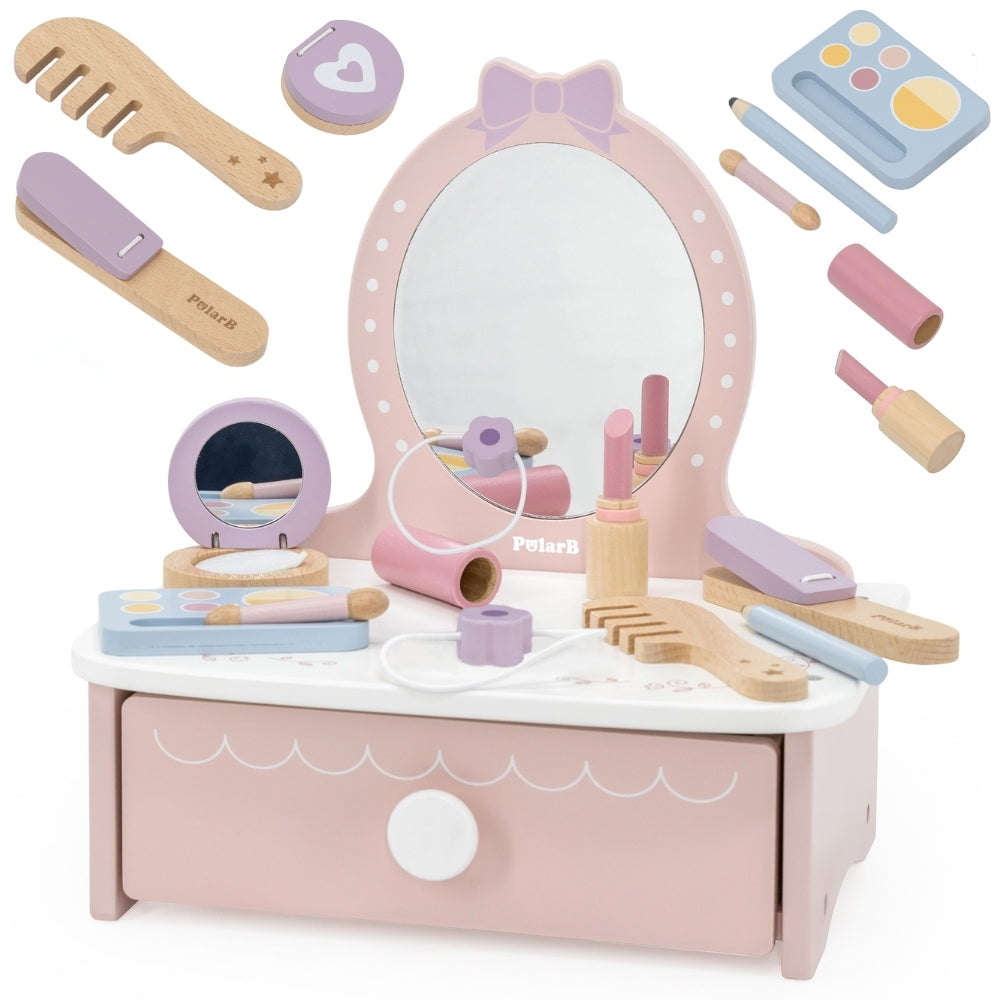 Šis žavus medinis tualetinis staliukas yra puikus pasirinkimas mergaitėms nuo 3 metų, mėgstančioms grožio ritualus ir imitacinius žaidimus. Tai dovana, kuri padeda ugdyti socialinius įgūdžius ir leidžia mėgautis savo asmeniniu grožio kampeliu.