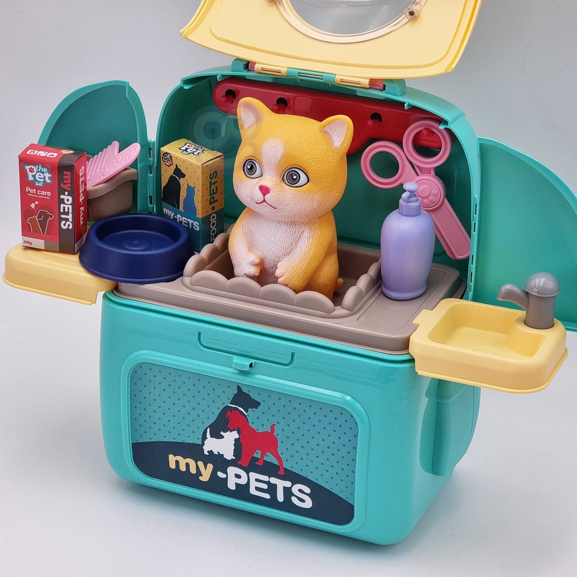 - Išsamus Priedų Rinkinys: Komplekte yra katės figūrėlė, dubenėlis, žirklės, šukos, šampūnas, kriauklė su čiaupu, lentyna ir kitos priemonės priežiūrai.