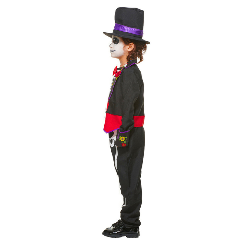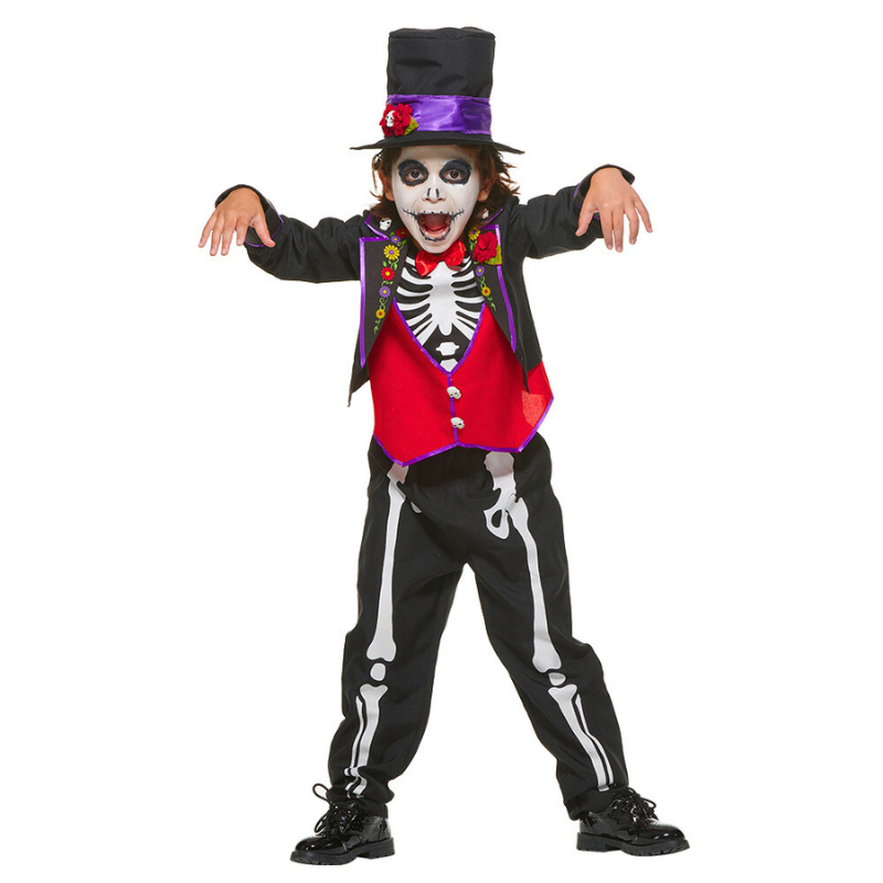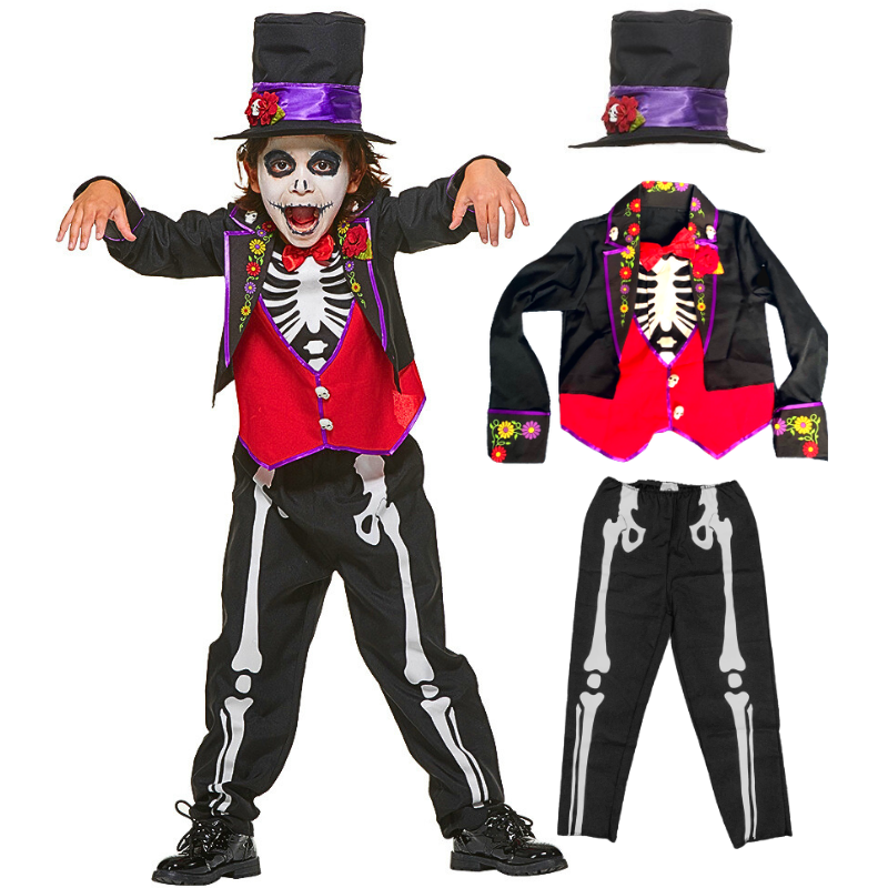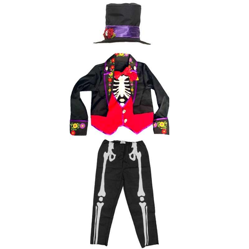 Visas kostiumas dekoruotas realistišku, trimatiniu kaukolės raštu priekyje.