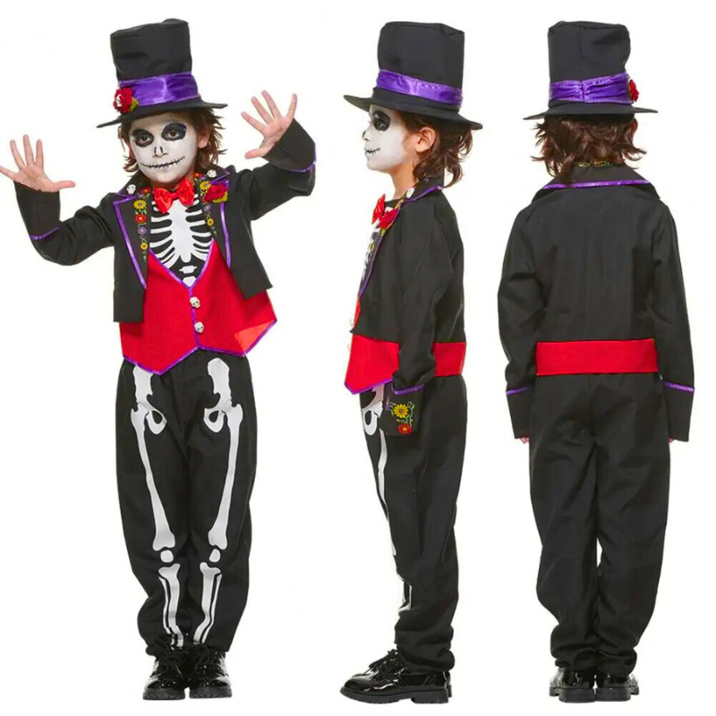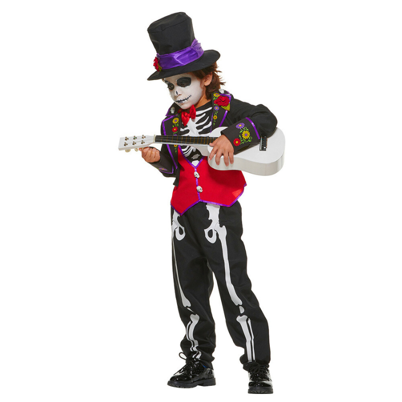 Fantastiškas kostiumas, puikiai atspindintis Meksikiečių Dia de los Muertos temą.