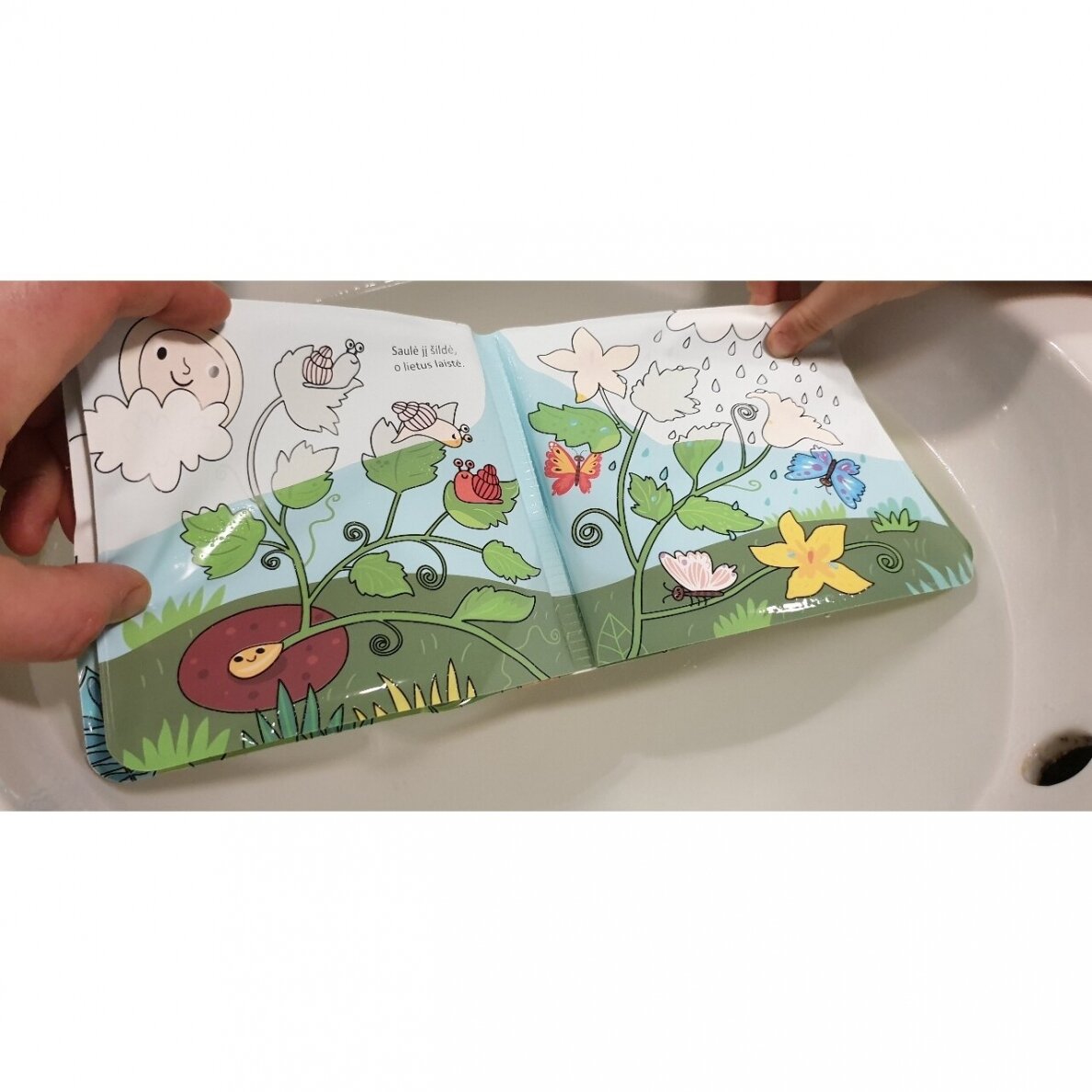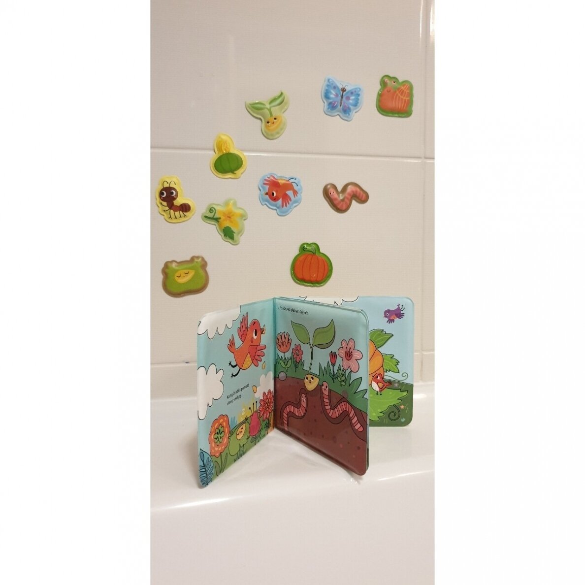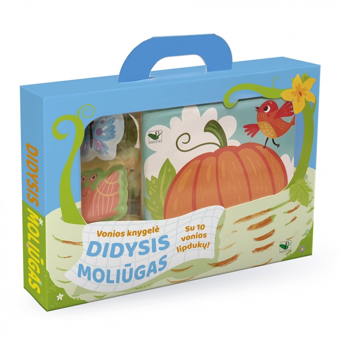 Merkite ją į vandenį ir stebėkite, kaip atgyja piešinėlių spalvos! Arba knygelės puslapius galite spalvinti vandenyje pamirkytu teptuku. Piešinėliai papasakos vaikui apie tai, kaip kartą atsirado didžiulis moliūgas! Be to, mažylis galės žaisti su daugkartiniais vonios lipdukais! Tad maudynės jam taps maloniu ir laukiamu vakaro įvykiu!