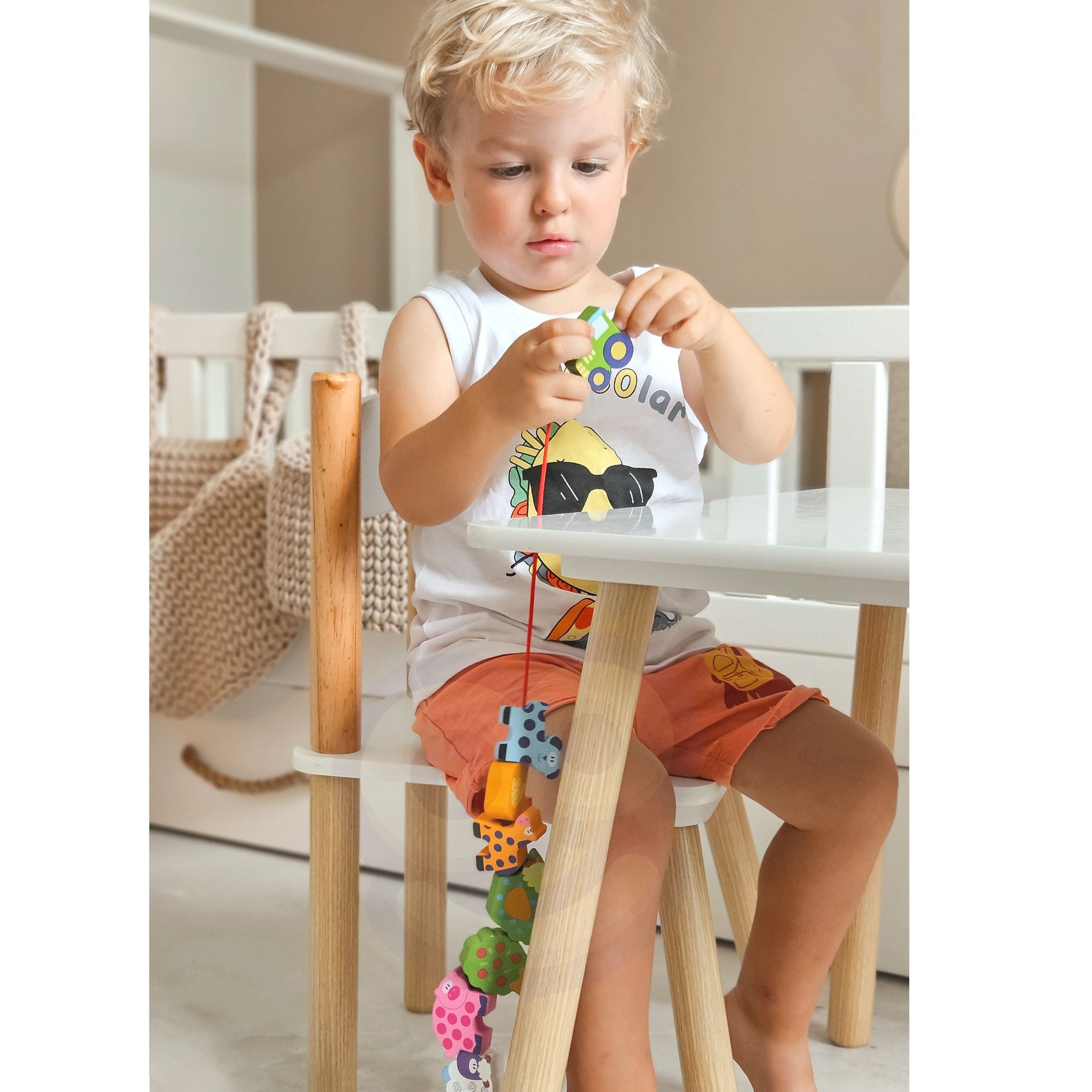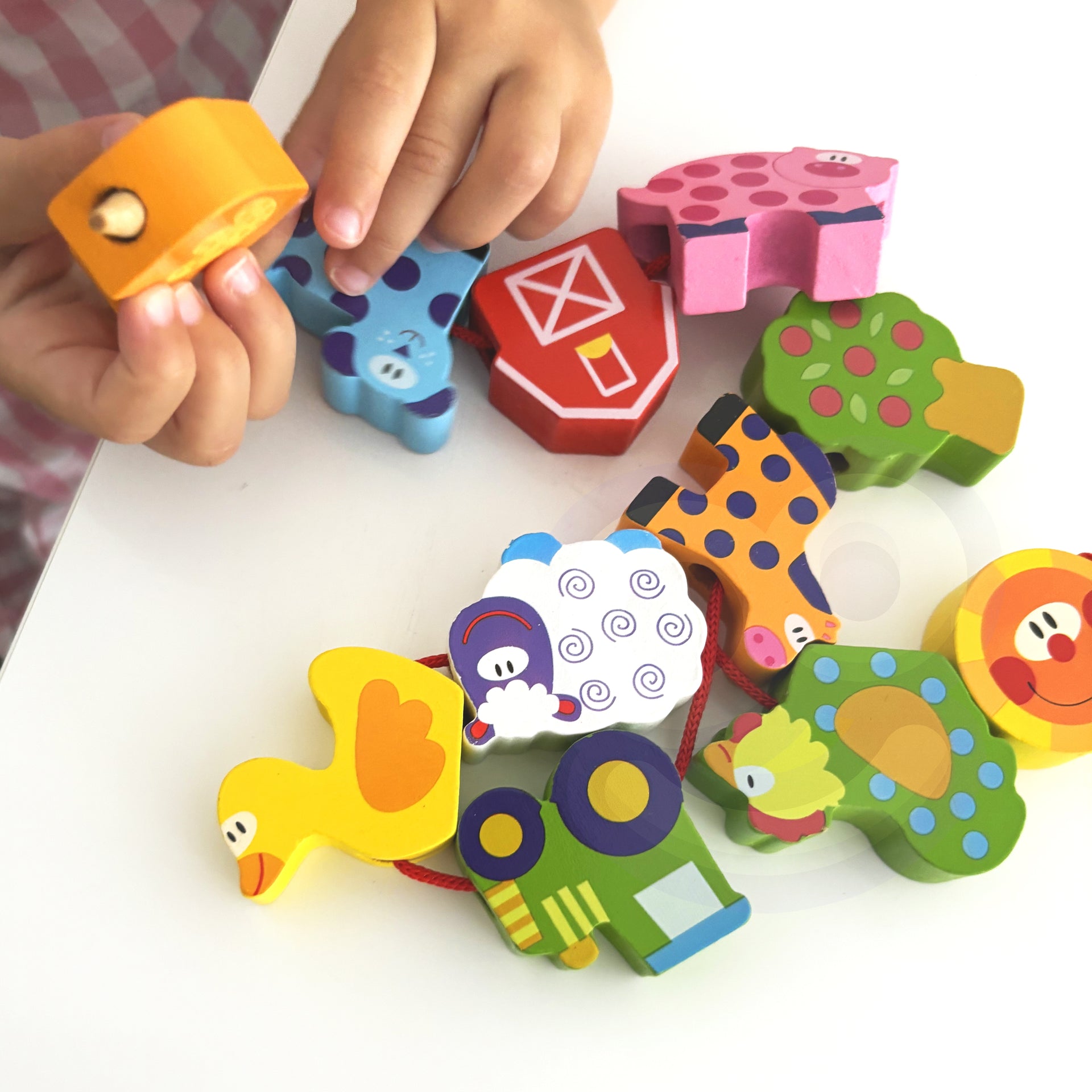 Woopie Green medinių kaladėlių rinkinys su virvele – tai smagus ir lavinantis Montessori tipo žaislas, padedantis vaikams pažinti ūkio gyvūnus, lavinti smulkiąją motoriką, rankų-akių koordinaciją ir kūrybiškumą. Vaikai gali savarankiškai verti figūrėles ant virvelės, mokytis pavadinimų ir kurti įvairius žaidimo scenarijus.