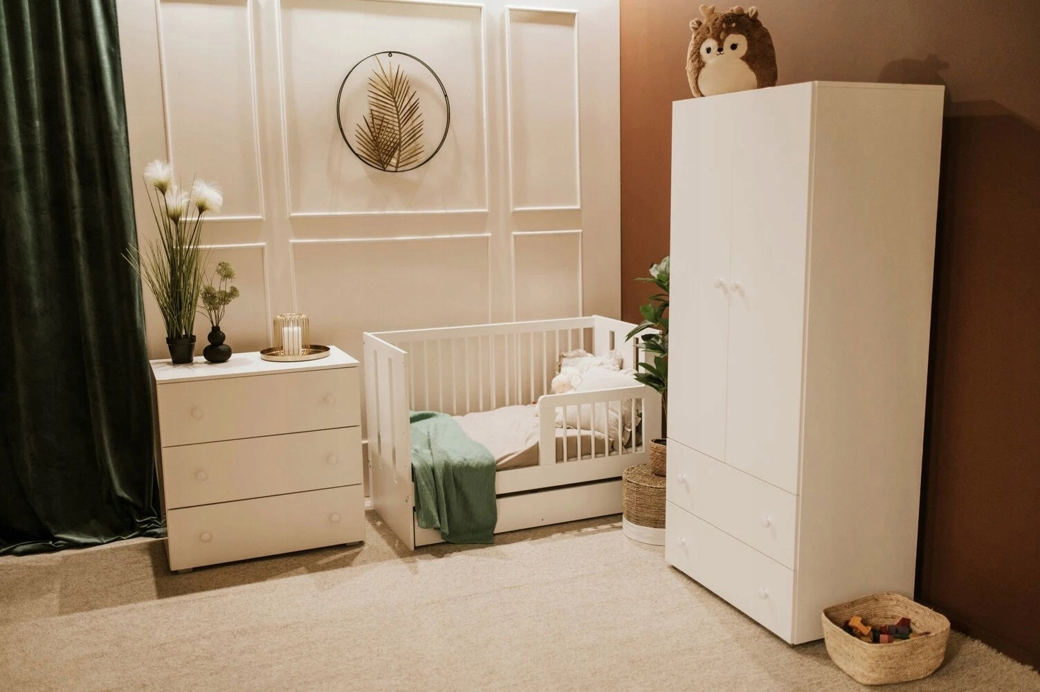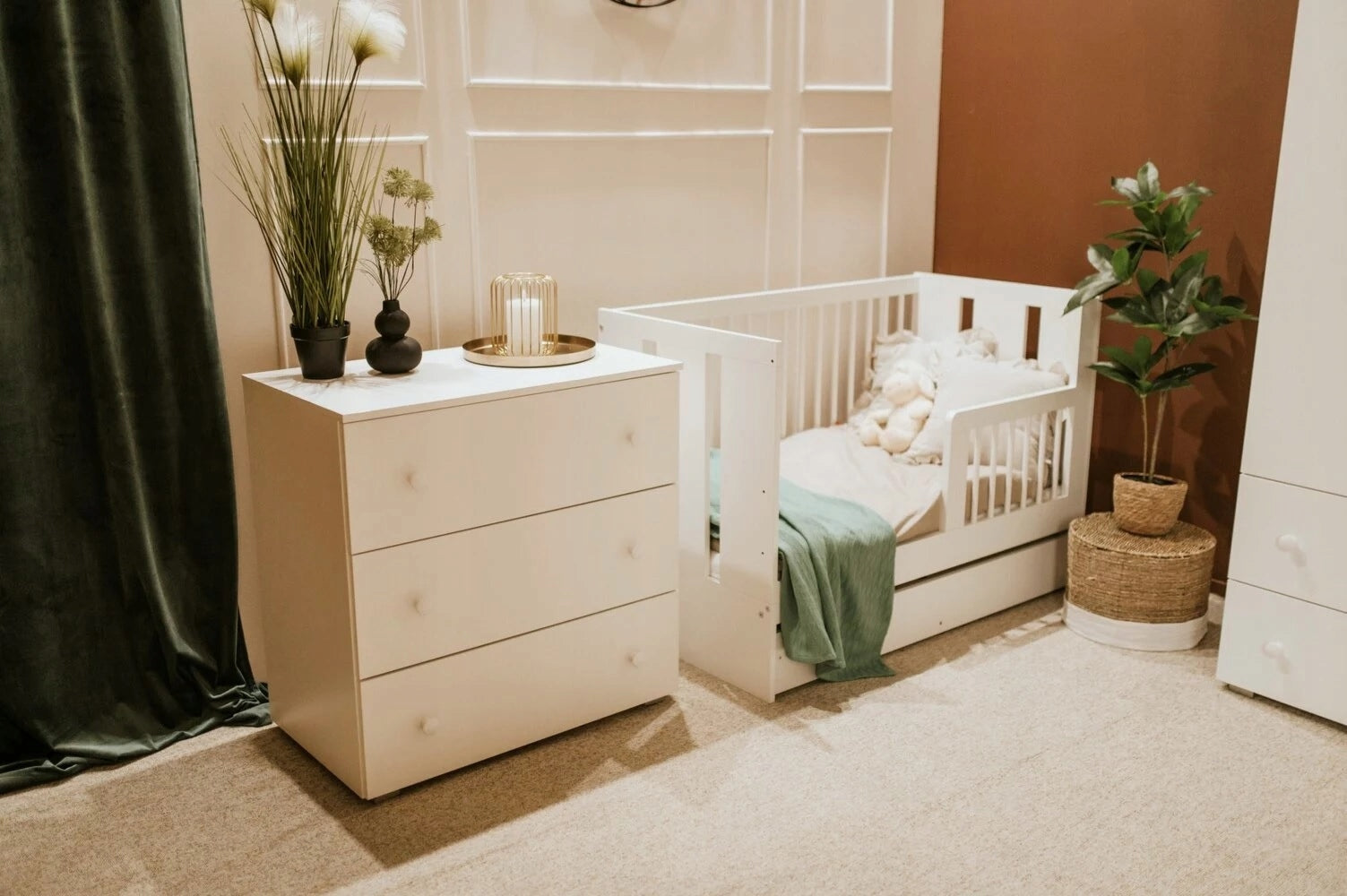 Balta komoda su stalčiais ir pervystymo stalu vaikų kambariui – pagrindinis vaizdas