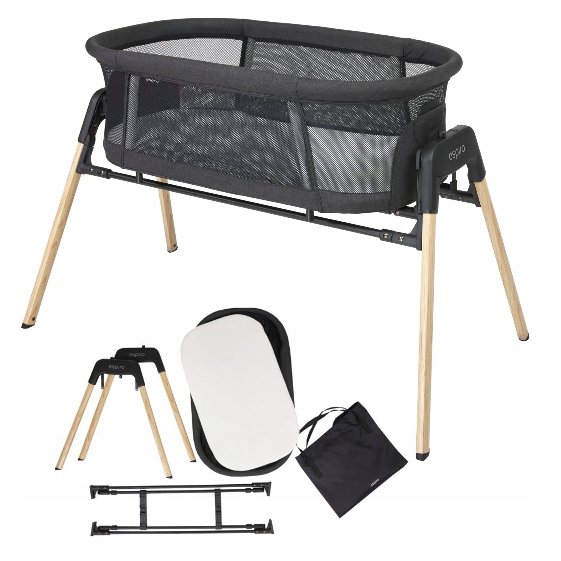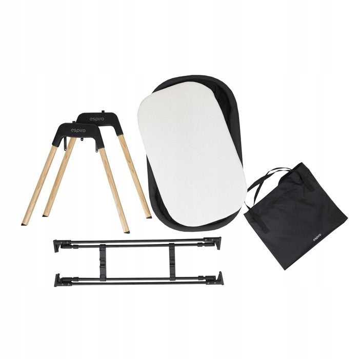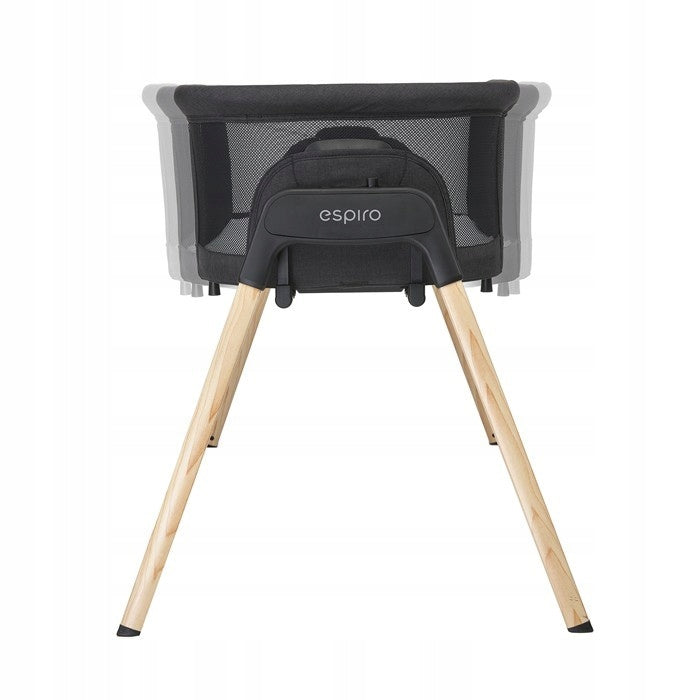 Juoda medinė sūpuoklė-lova kūdikiams su rėmu ir čiužiniu – pagrindinis vaizdas