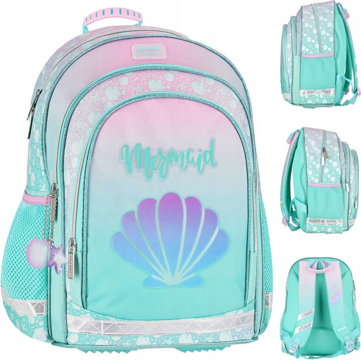 Mokyklos kuprinė-tornisteris, mergaitei, pastelinis kriauklių ir undinėlių raštas – pagrindinis vaizdas
