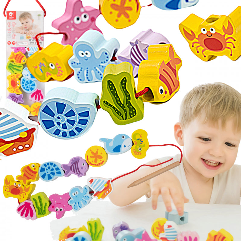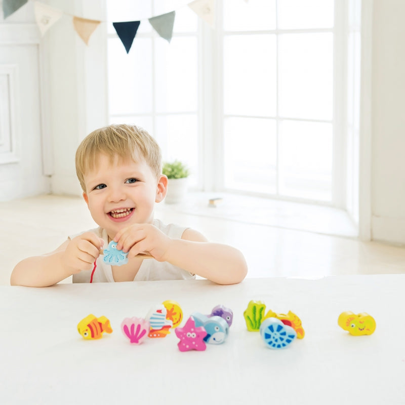 CLASSIC WORLD Medinės virvelinės kaladėlės Aquatic Animals 13 vnt.