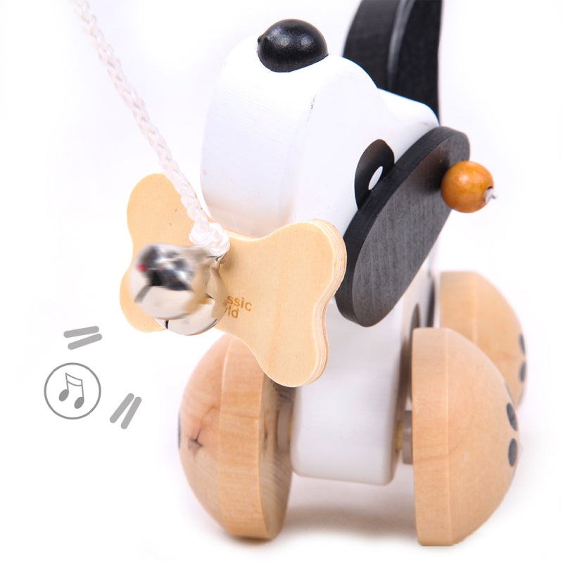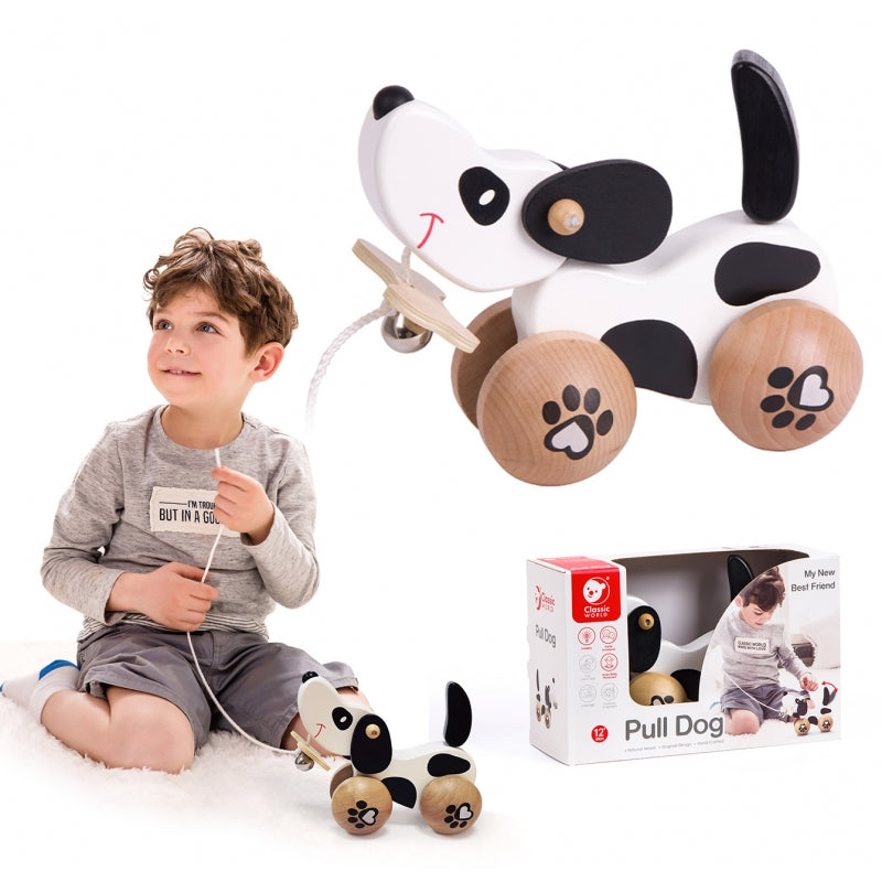 Classic World Dog Pull yra pagamintas iš medžio Jame rodomas žavus šuo su šortais, kuris tempiamas už virvelės ir seka paskui vaiką. Jame yra 4 apskritimai su nubrėžtomis letenėlėmis, lanksčiomis ausimis ir plačia šypsena. Šuo yra idealus žaislas mokantis vaikščioti, nes skatina judėti.