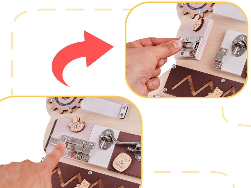 Iš pradžių žaidimas su lenta gali sukelti daug sunkumų! Spynų, sagčių atidarymas ir kitų „galvosūkių“ sprendimas pareikalaus daug susikaupimo ir dėmesio ! Kad suprastų, kaip veikia kai kurie elementai, mažylis turės parodyti kantrybę!