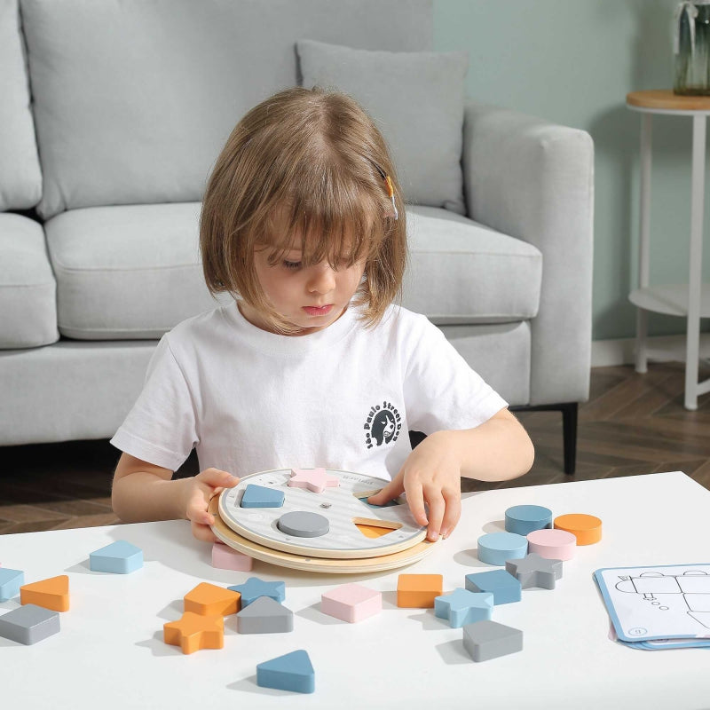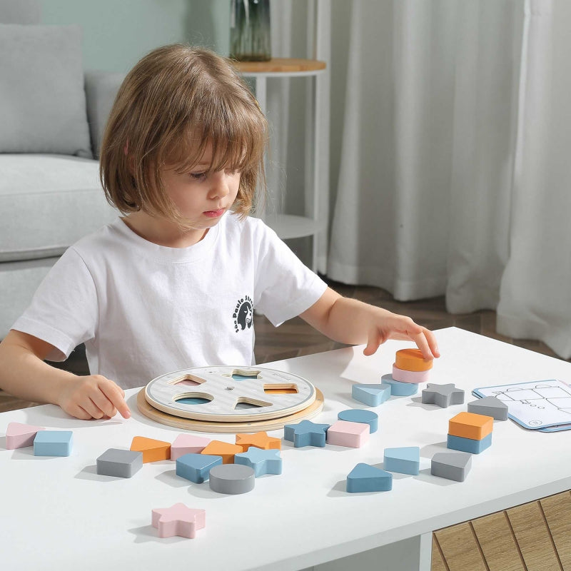 - vaiko užduotis yra kaladėlių spalvas ir formas priderinti prie lentoje esančių skylučių (pasukus viršutinę lentos dalį galime pakeisti lentoje esančių raštų spalvą)