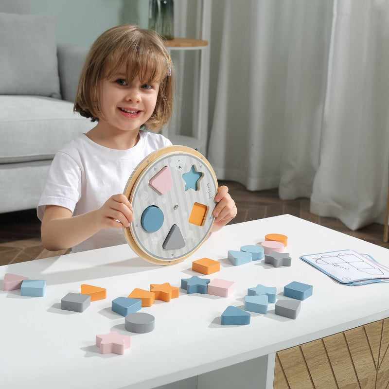 Formos ir spalvų derinimo dėlionė – idealus gaminys patiems mažiausiems. Rinkinį sudaro spalvingos įvairių formų kaladėlės, maišelis kaladėlėms, kortelės ir lentelė kaladėlėms dėti. Žaislas vienu metu moko, lavina ir linksmina. Kaladėlės dažytos netoksiškais dažais švelniomis spalvomis, kurios patraukia vaiko dėmesį. Gaminys pagamintas iš aukštos kokybės medžiagų ir didelis dėmesys detalėms Dėlionė priklauso populiariajai PolarB serijai