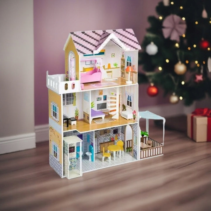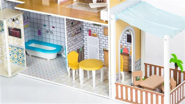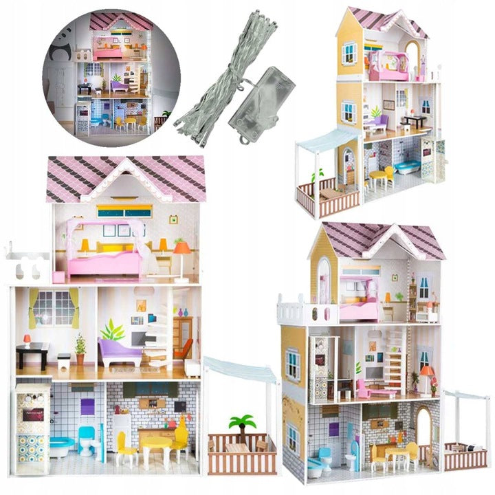 Atraskite įspūdingą trijų aukštų, net 120 cm aukščio medinį lėlių namelį, sukurtą įtraukiamam ir kūrybiškam vaikų žaidimui! Šis erdvus namelis su terasa ir veikiančiu liftu turi net 8 skirtingus kambarius, kuriuos puošia komplekte esantys mediniai baldai ir aksesuarai. Kruopščiai išdirbtos detalės, natūralios medžiagos ir stabilus dizainas užtikrina ilgaamžį ir saugų naudojimą.