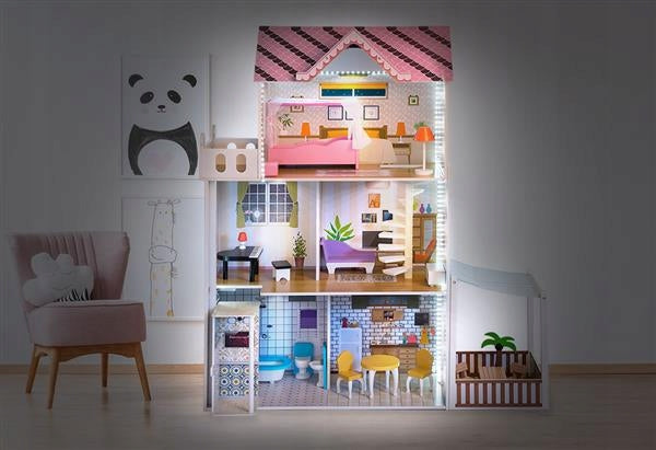 Šis žavingas medinis namelis su LED apšvietimu – tai žaislas, kuris įkvepia kurti, pasakoti ir žaisti be galo!