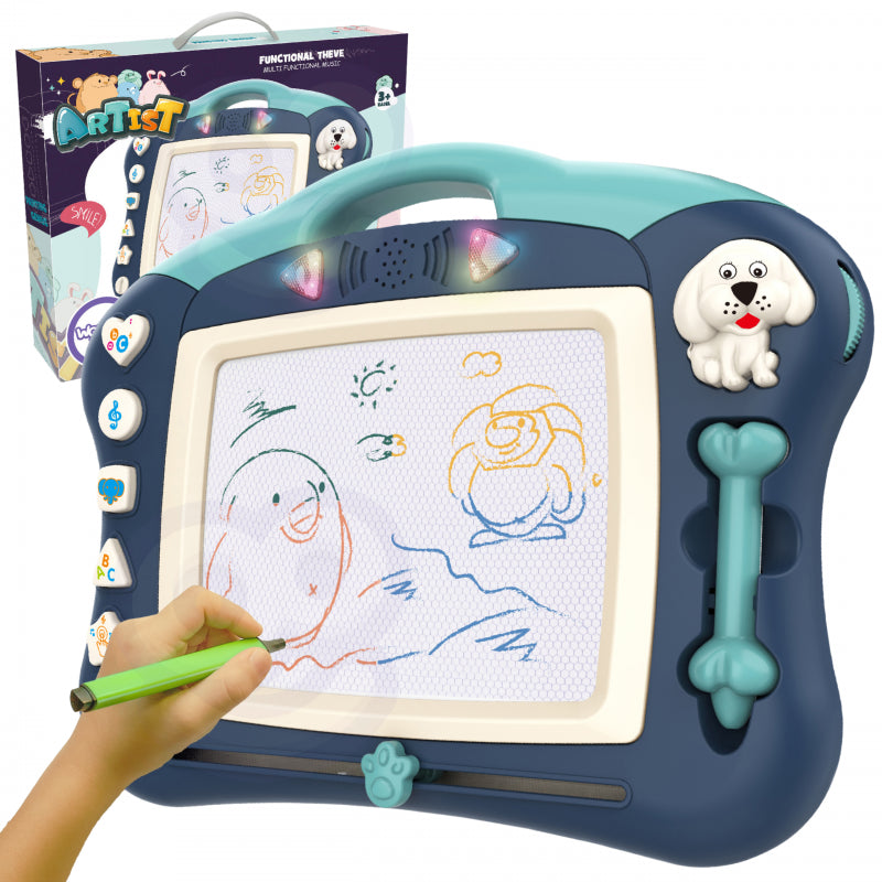 Magnetinė lenta suteikia galimybę ilgai leisti laiką kūrybiškai! Lenta skatina rašyti ir piešti . Piešimas padės susikaupti , nusiraminti ir nuraminti vaiką. Iškarpų albumas leidžia sukurti be galo daug paveikslėlių – tereikia pajudinti specialų slankiklį ir piešinys išnyks ir galėsite piešti vėl! Komplekte taip pat yra patogus, patogus stebuklingas rašiklis . Be to, 5 daugiafunkciniai mygtukai: dainos, melodijos, gyvūnai, raidės ir konvertavimo mygtukai . Skleidžiant garsus, lenta užsidega ir patraukia vaiko akį. Lenta turi patogią rankeną , todėl vaikas gali ją pasiimti bet kur, o lentoje yra kojelių , kurios palengvina rašymą prie stalo. Aprašymas lavins vaiko rankinius įgūdžius, vaizduotę, kūrybiškumą ir padės lavinti vaiko meninę pusę!