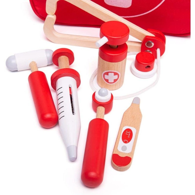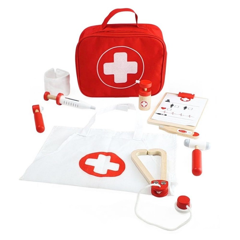 - rinkinyje rasite: vaistų buteliuką, refleksinį plaktuką, otoskopą, termometrą, švirkštą, stetoskopą, daktaro užrašų lentelę, prijuostę, tvarstį ir patogų medžiaginį krepšį;