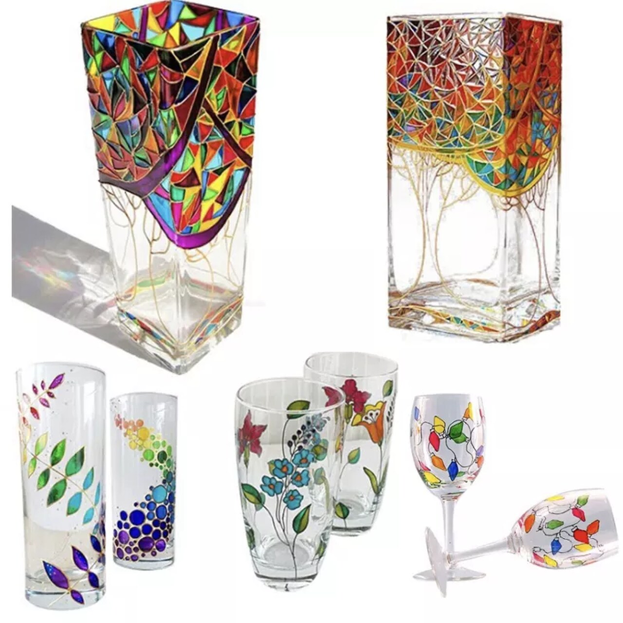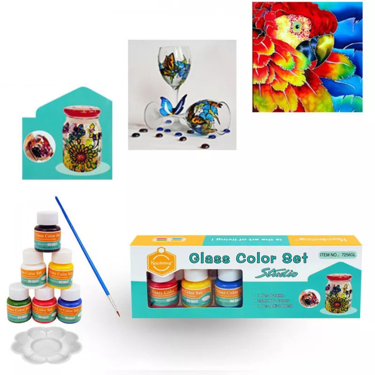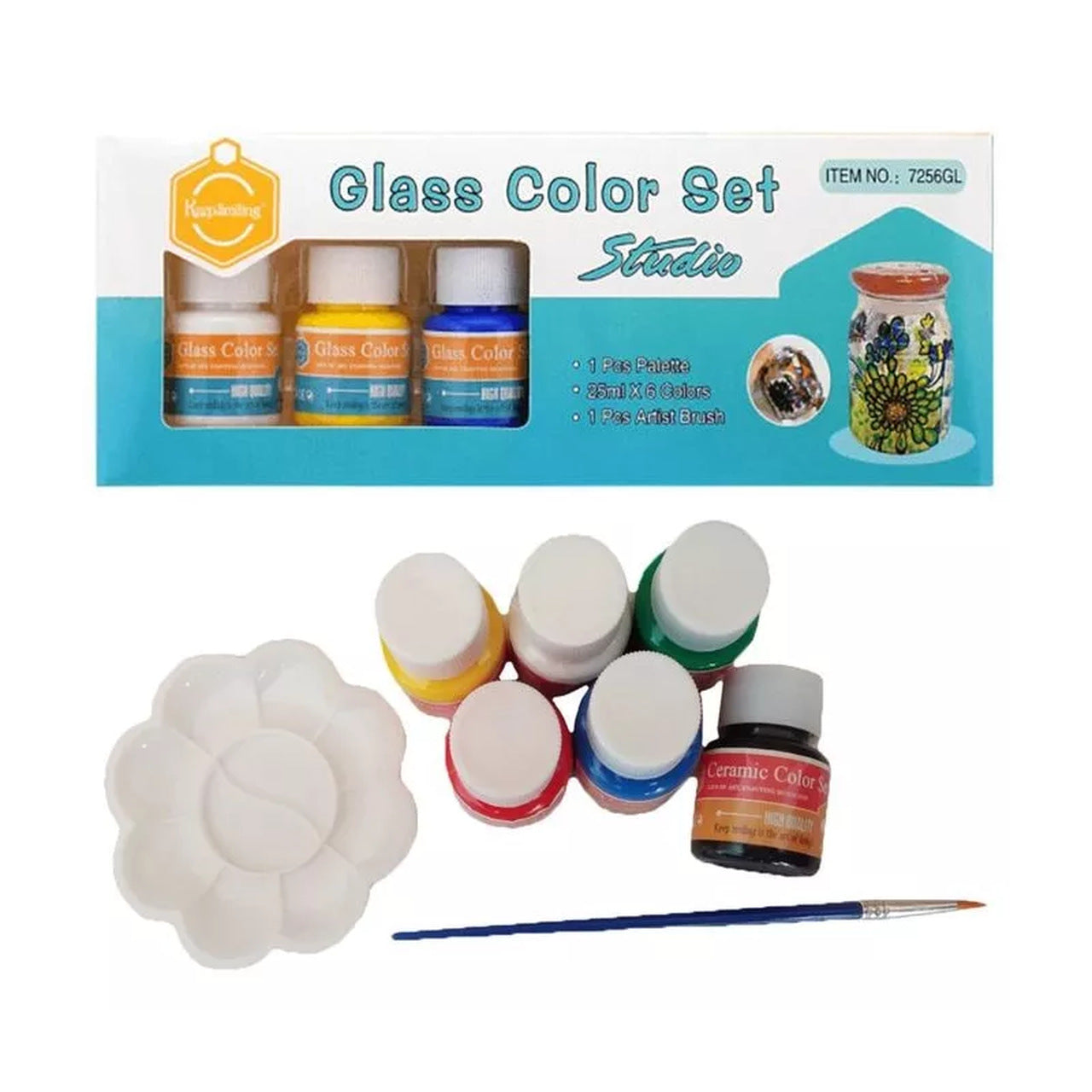 Dažų rinkinys stiklui - 6 ryškios, pusiau dengiančios spalvos, kiekviena po 25 ml.