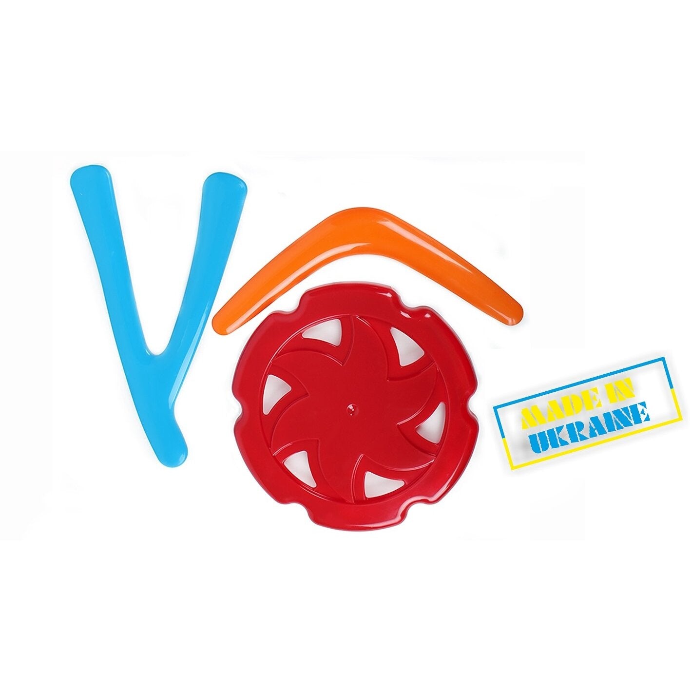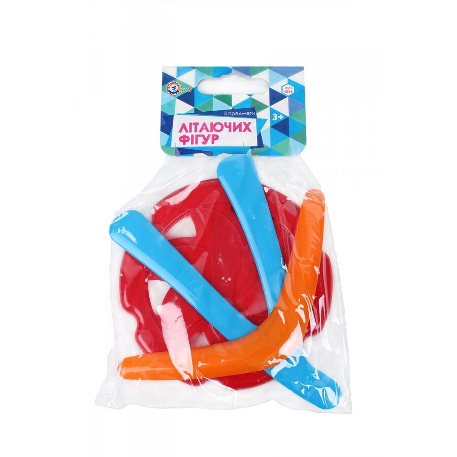 Trijų skraidančių figūrėlių rinkinys – „modernaus“ stiliaus skraidantis diskas ir du bumerangai – klasikinis ir modernus. Turėsite puiki? galimybę žaisti įvairius frisbiui rekomenduojamus žaidimus – „Freestyle“, „Dog-frisbis“, „Disk-golf“, o bumerangai suteiks galimybę pasijusti tikru profesionalu. Ypač tai įdomu šeimos veiklai lauke.
