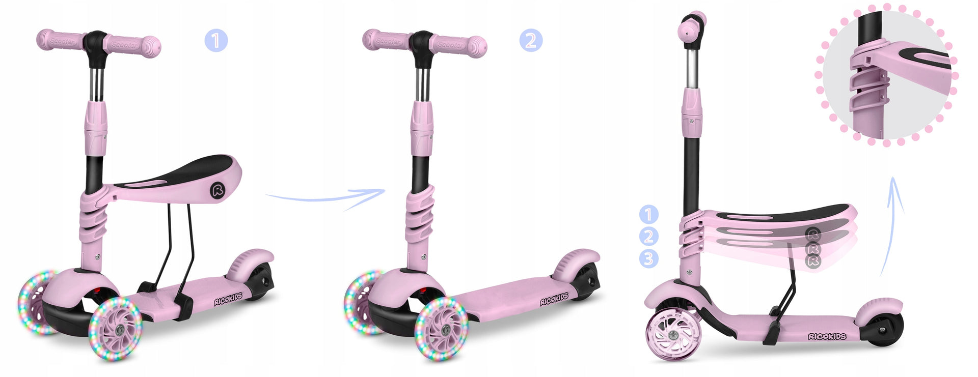 3 pozicijų reguliuojamas sėdynės ir vairo aukštis. Nuimama sėdynė. Pakojo stabdys.
