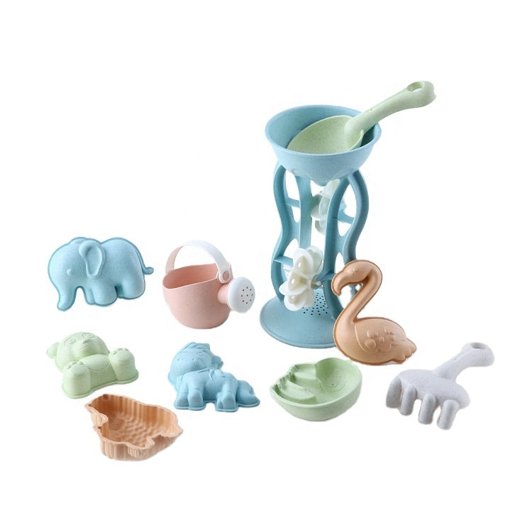 - Gausi komplektacija: Rinkinį sudaro net 10 dalių: vandens ratas, laistytuvas, kastuvėlis, grėbliukas ir šešios skirtingos smėlio formelės.