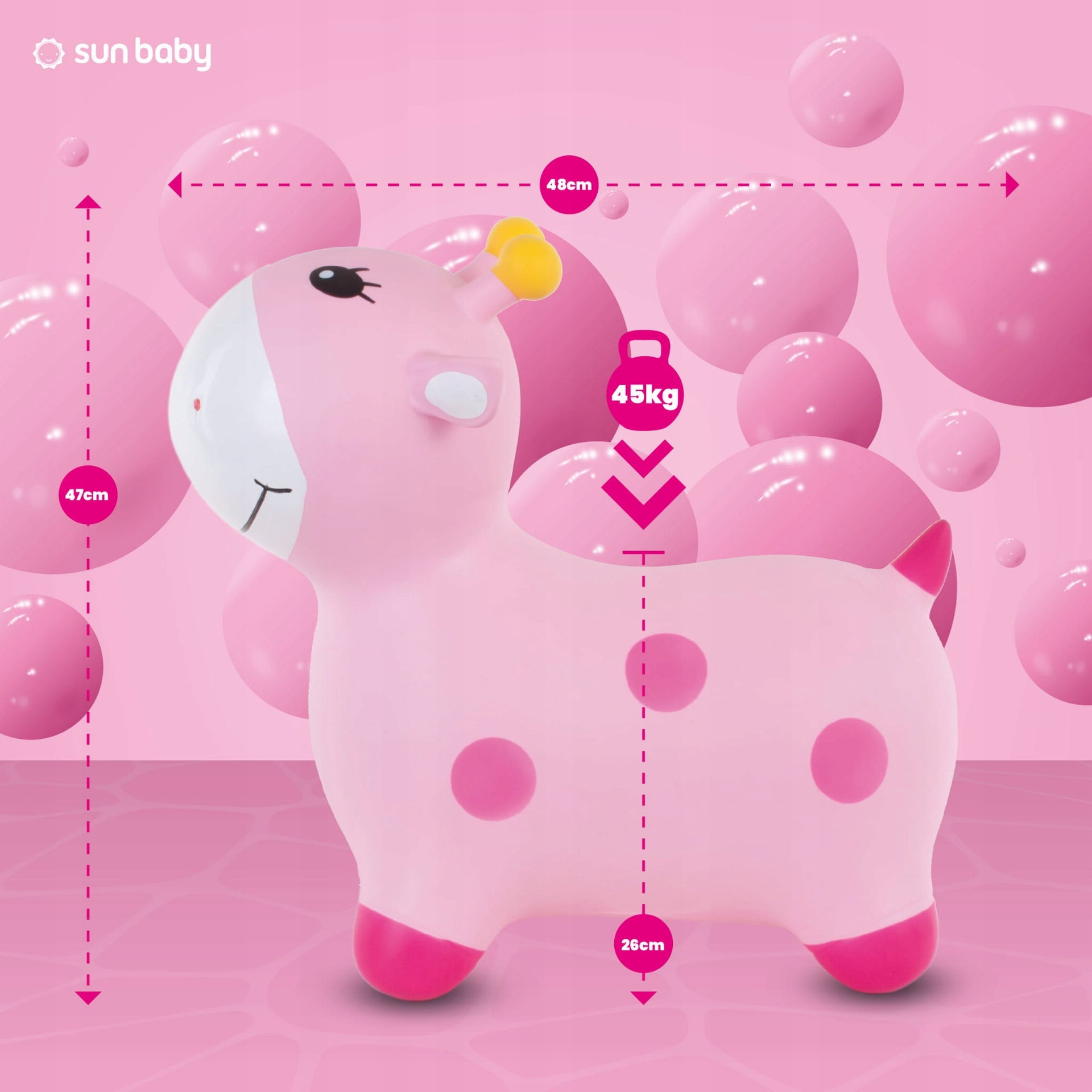 Matmenys: ilgis 48 cm, didžiausias plotis 26 cm, aukštis (ausų/ragų vieta) 43 cm, sėdynės aukštis 26 cm, sėdynės plotis 23 cm, aukštis 47 cm (šokliuko matmenys gali skirtis priklausomai nuo pripūtimo laipsnio).