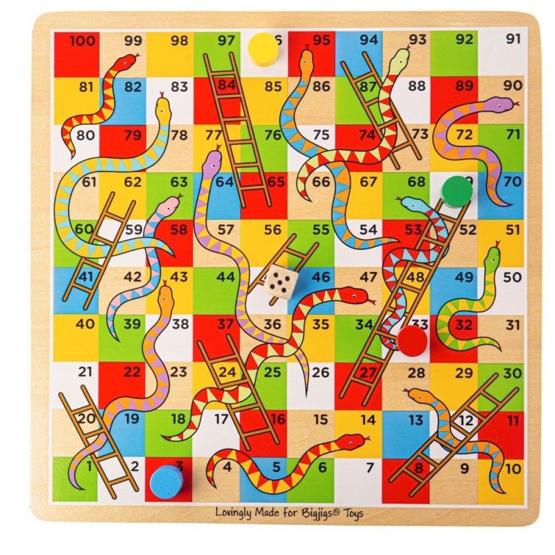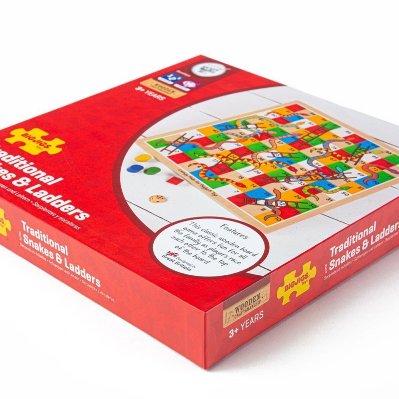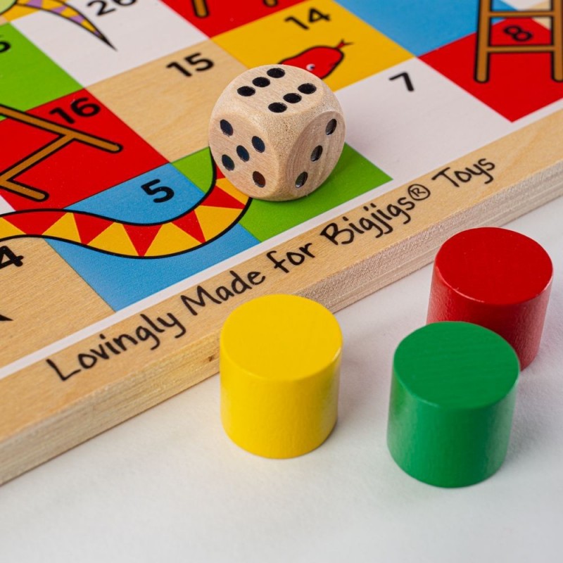 Bigjigs stalo žaidimas Gyvatės ir kopėčios. Vienu metu gali žaisti 4 asmenys. Žaidimo metu žaidėjai paeiliui meta kauliuką ir lenktyniauja, kuris pirmas pasieks finišą. Jums pasisekė, jei įžengėte į langelį su kopėčiomis ir jos jus perkėlė arčiau finišo, tačiau tikrai turėtumėte saugotis gyvačių, kurios jus grąžina arčiau starto.