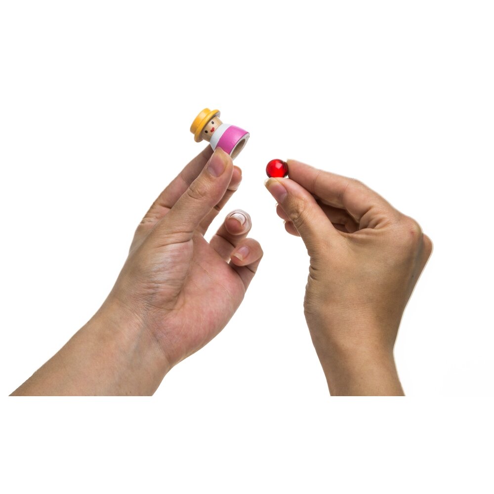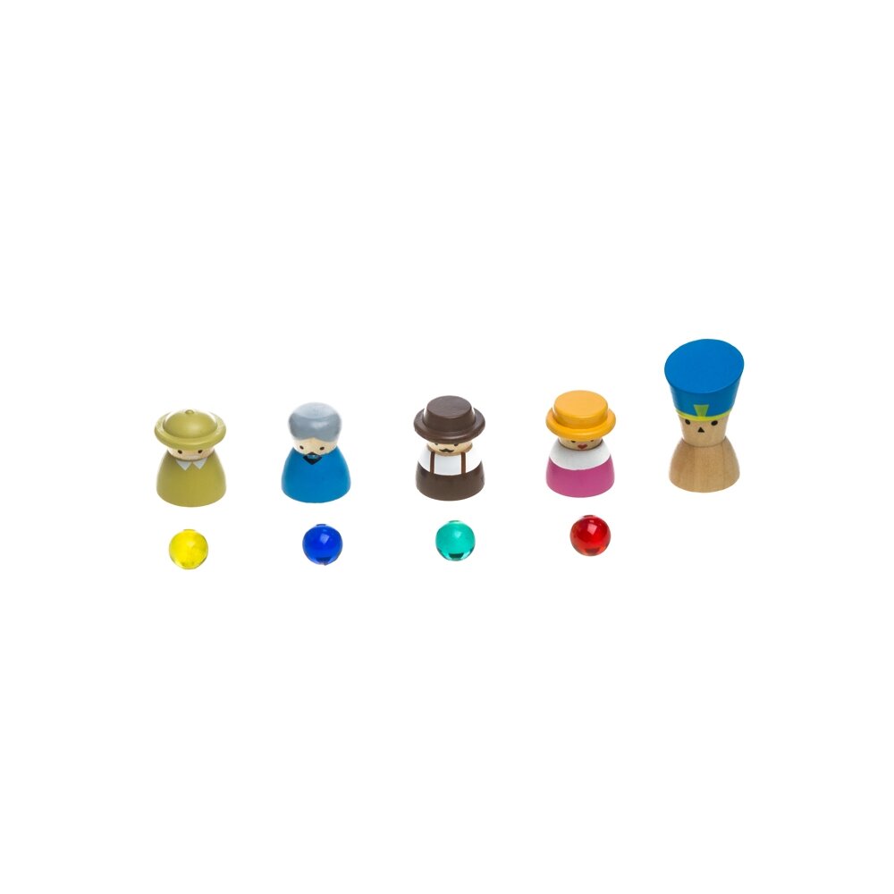 Piramidės formos kartoninis erdvinis (3D) surenkamas stalo žaidimas su medinėmis figūrėlėmis ir stikliniais rutuliukais.