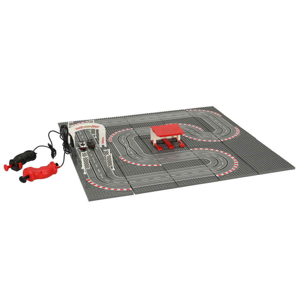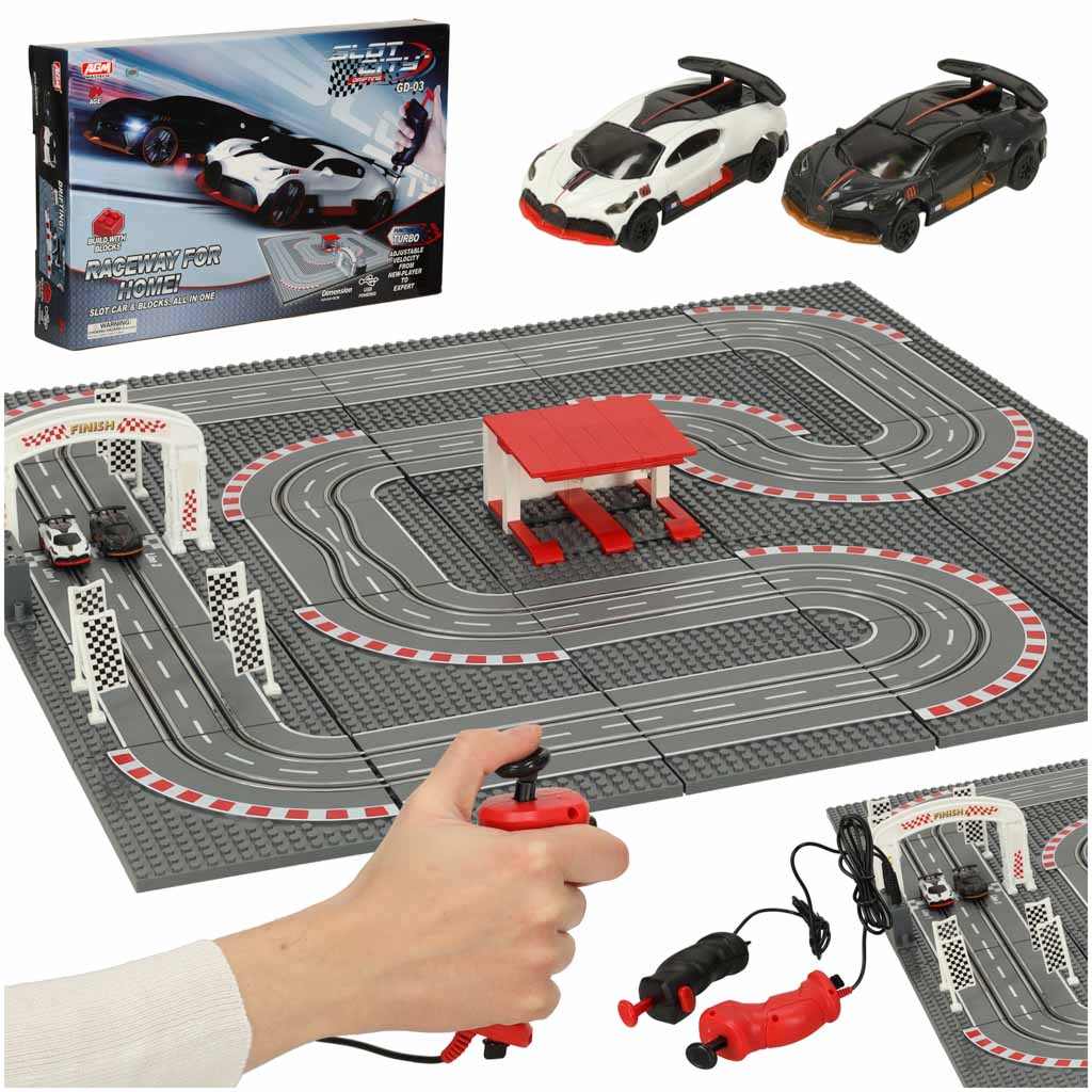 64x64 cm elektrinė lenktynių trasa suteikia galimybę organizuoti dinamiškas lenktynes. Du sportiniai automobiliai valdomi vairasvirtėmis, kurios leidžia sklandžiai reguliuoti automobilio greitį. Komplekte yra statybiniai blokeliai, su kuriais vaikai gali pastatyti garažą transporto priemonėms. Žaislas lavina rankų ir akių koordinaciją, refleksus, smulkiąją motoriką. Atkuriant takelį reikia nuolat prijungti prie maitinimo šaltinio.