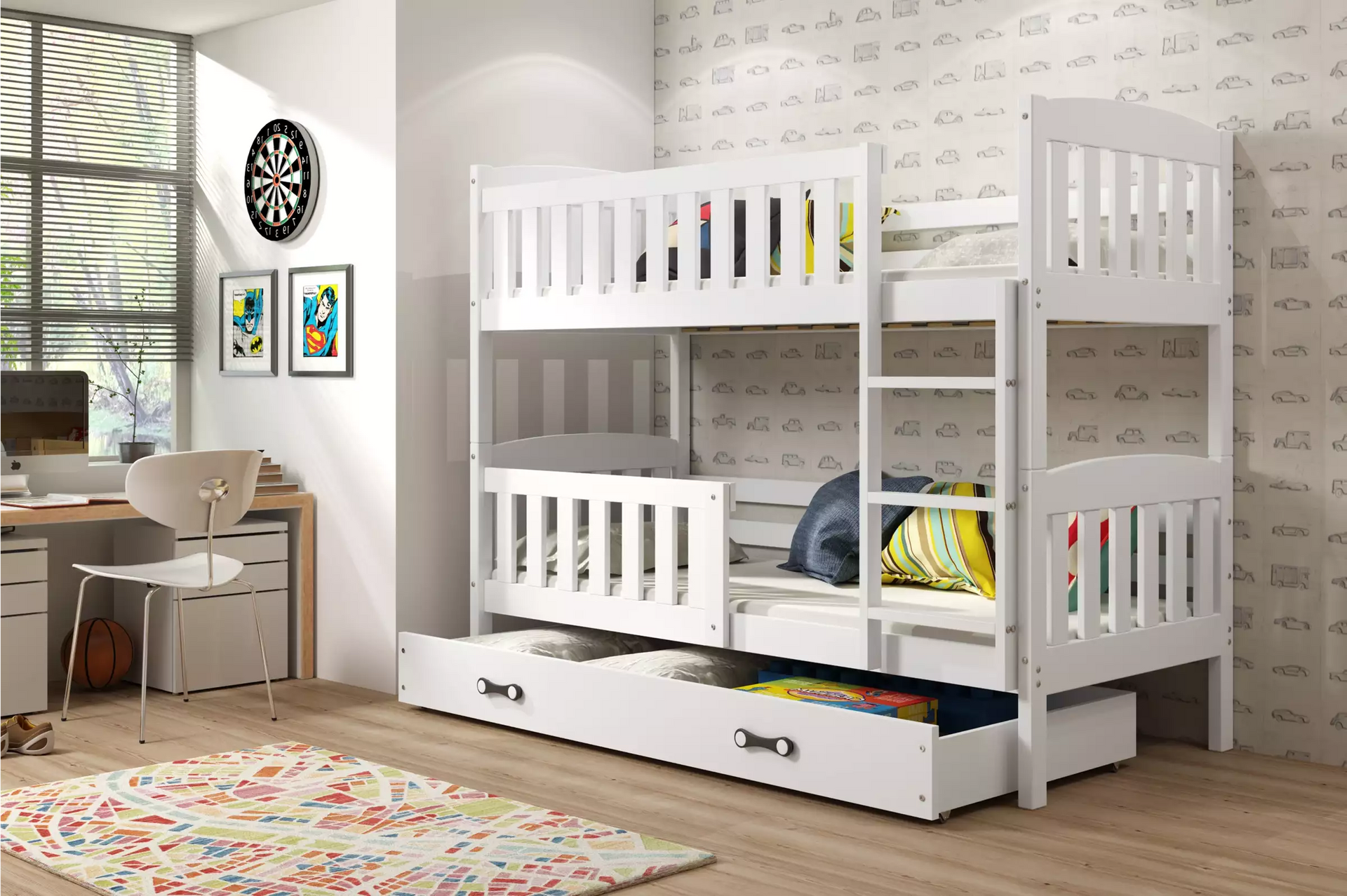 Suvokiame, kaip sunku vieną kambarį pritaikyti dviems vaikams, ko gero, visiškai skirtingų charakterių ir skonių. Žinome, kaip svarbu kovoti dėl kiekvieno centimetro. Todėl į savo pasiūlymą įtraukėme Kubuś dvigulę lovą, kuri yra puikus sprendimas bent kai kurioms jūsų išdėstymo problemoms. Dviejų aukštų struktūra leidžia optimaliai išnaudoti erdvę, paliekant daugiau erdvės žaisti ar mokytis. Konstrukcija iš pušies medienos sutvirtinta aukštos kokybės plieniniais varžtais yra stabili ir patvari. Tai savo ruožtu reiškia jūsų vaikų saugumą miego metu ir ramų poilsį. Galimybė įrengti turėklus abiejuose lygiuose – duoklė patiems mažiausiems ir rūpinimosi jais rezultatas. Jie apsaugo net pačius judriausius ir energingiausius vaikus nuo kritimo. Kliūtys yra universalios, Jūs nuspręsite dėl jų padėties surinkimo metu. Iš spyruoklinių lentų pagamintas rėmas puikiai palaiko stuburą. Grafito spalvą gavome nudažius medžio paviršių visiškai saugiais ir antialerginiais dažais, todėl gaminys yra saugus net jautrią odą turintiems vaikams. Neutralios spalvos tinka tiek berniuko, tiek mergaitės kambariui, o tai leis išvengti nepatogių diskusijų su mažyliais.