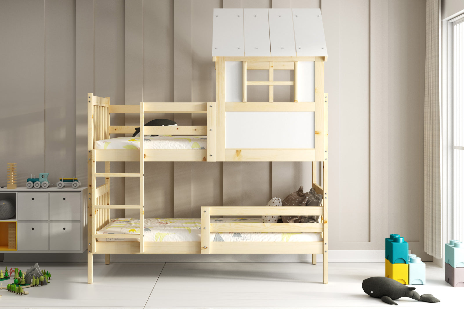 Dviaukštė lova „Cottage“ su stogeliu – „Kacper“ pagaminta iš natūralios medienos 90x190 su čiužiniu