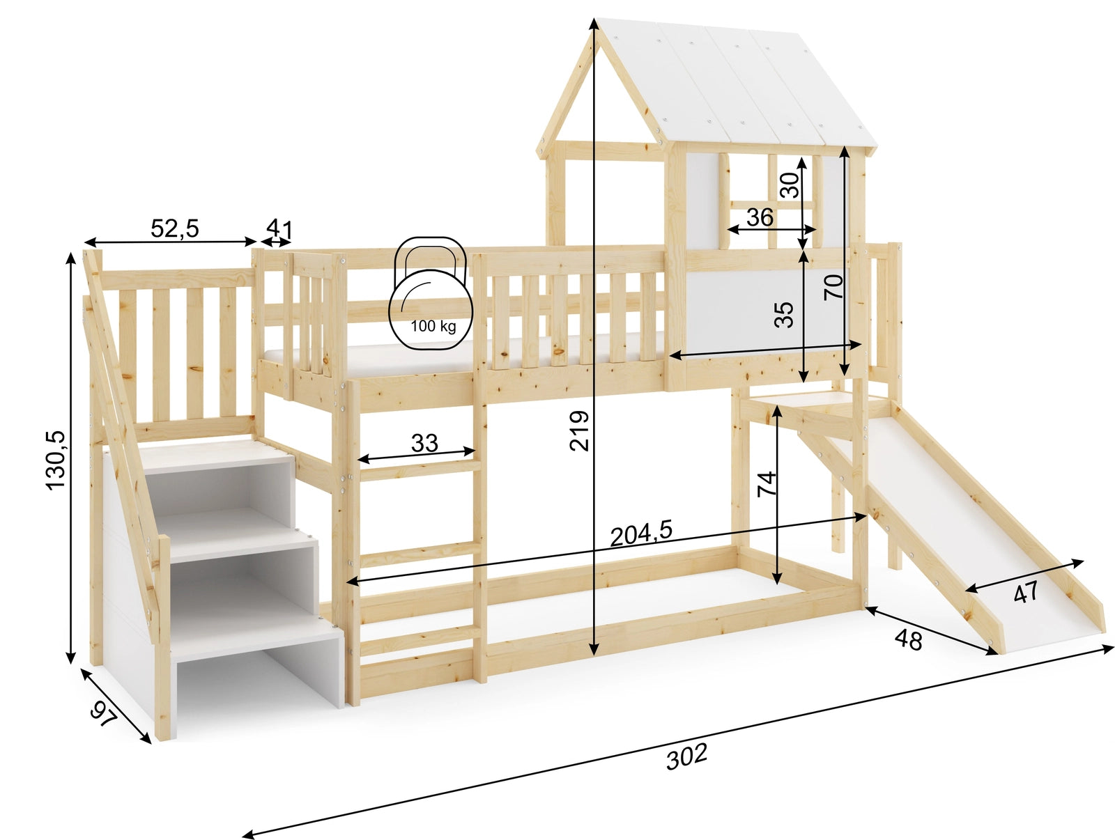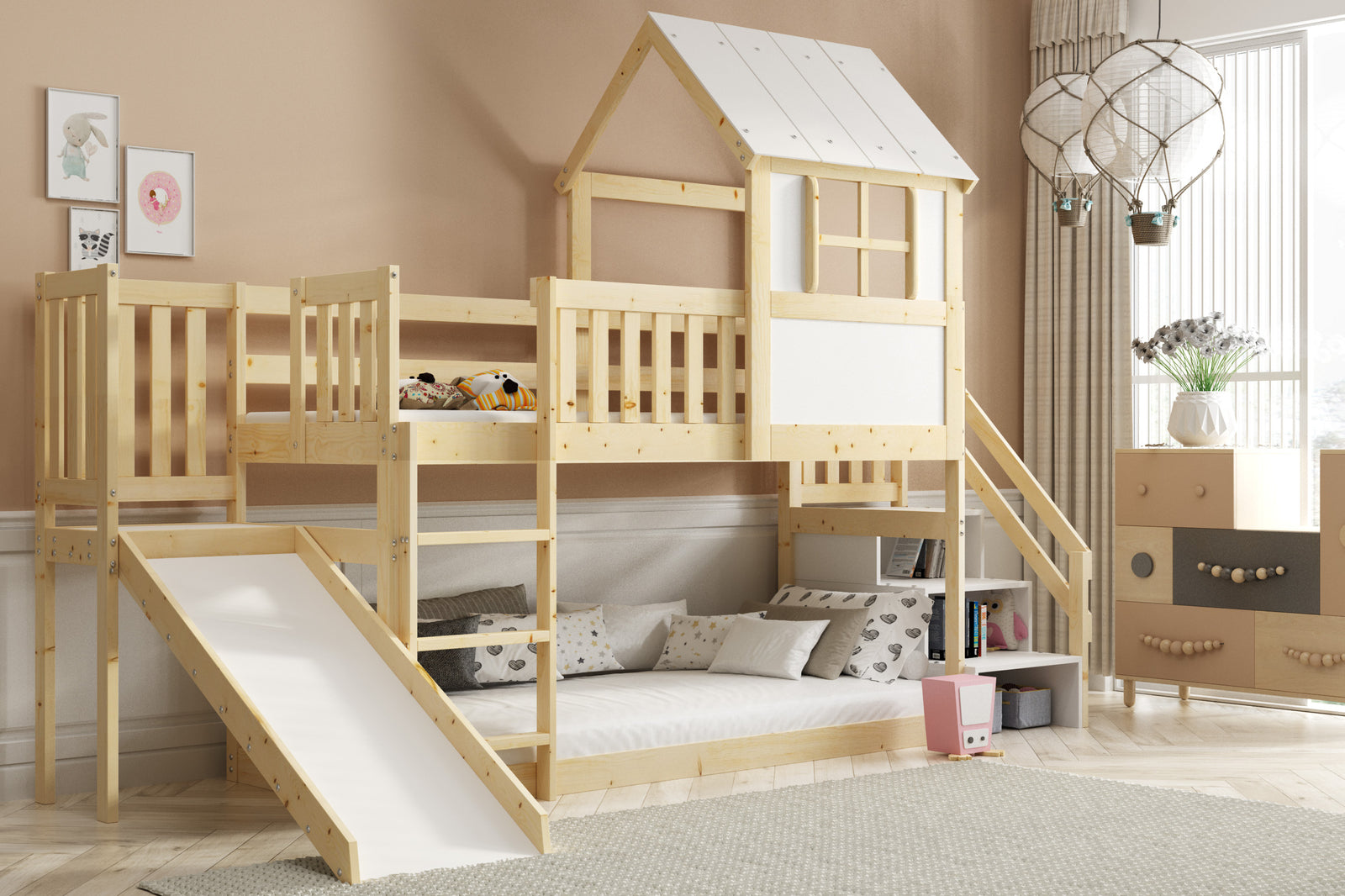 Dviaukštė lova su čiuožykla iš natūralaus medžio, 90x200, su čiužiniu