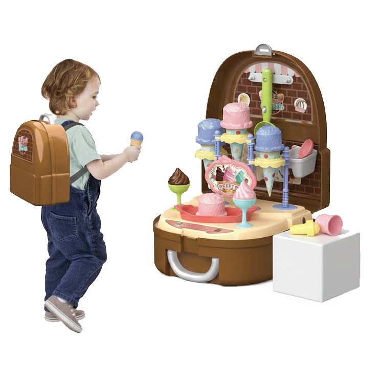 - Mobilumas ir patogumas: Dėl specialios konstrukcijos žaislas virsta patogia kuprine su dirželiais ant pečių, leidžiančia visą ledainės įrangą nešiotis su savimi.