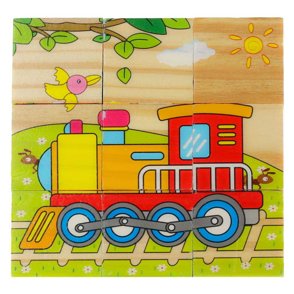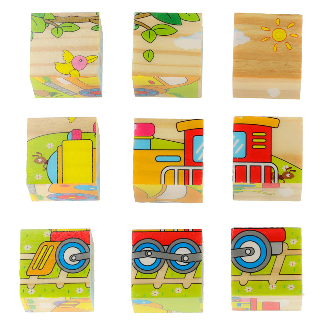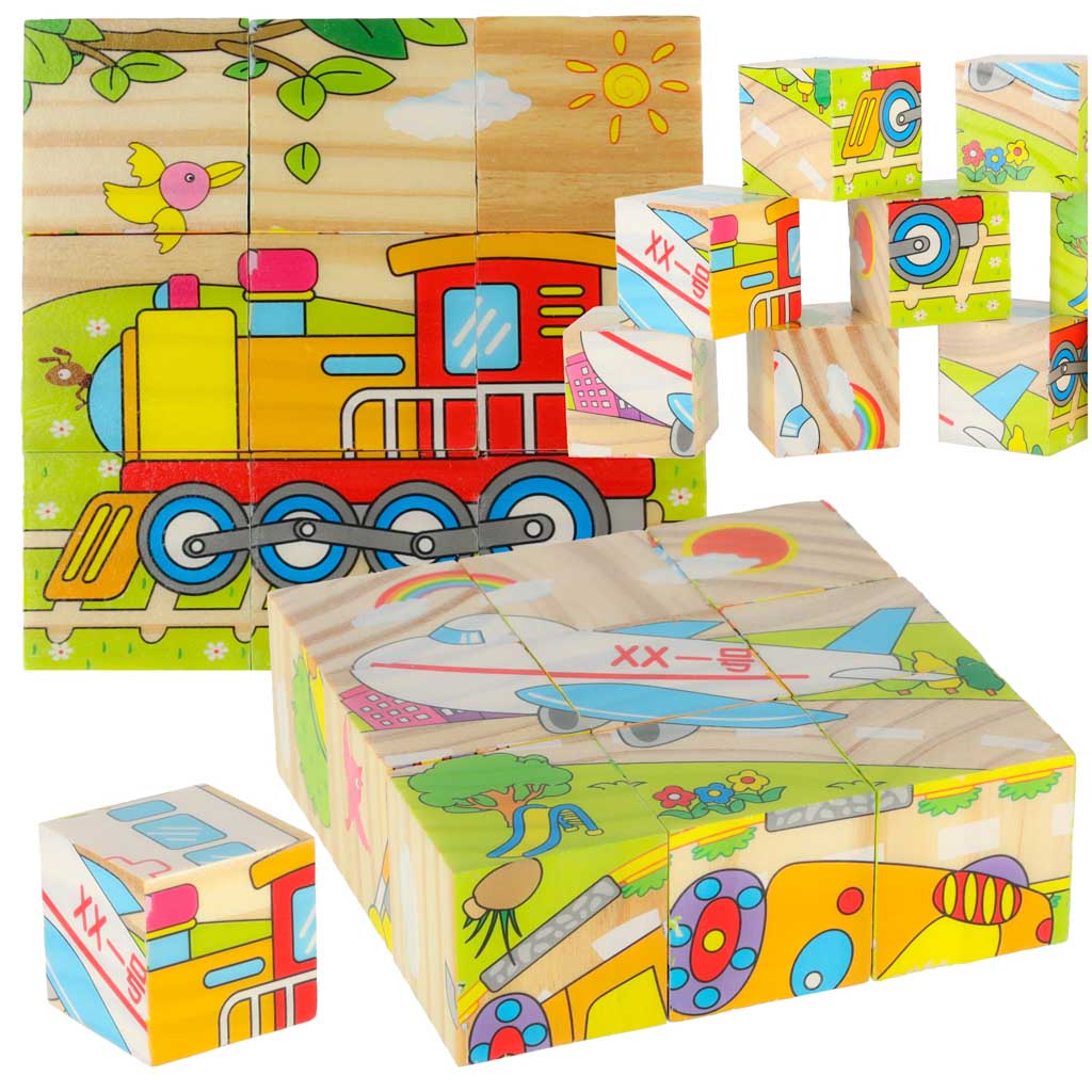 Rinkinį sudaro 9 vienodo dydžio mediniai spalvoti kubeliai.