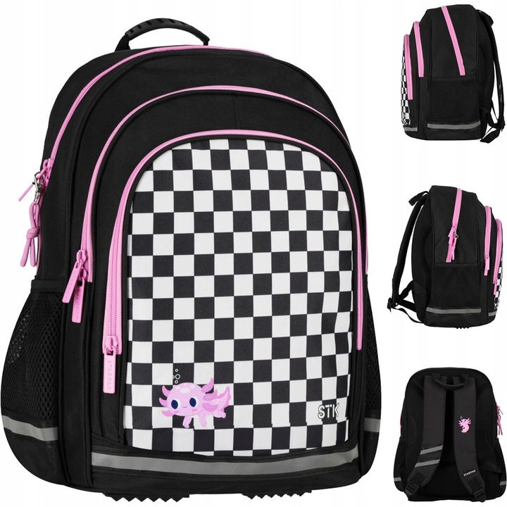Mokyklos kuprinė-tornisteris, mergaitei, šachmatų raštas su aksolotlu – pagrindinis vaizdas