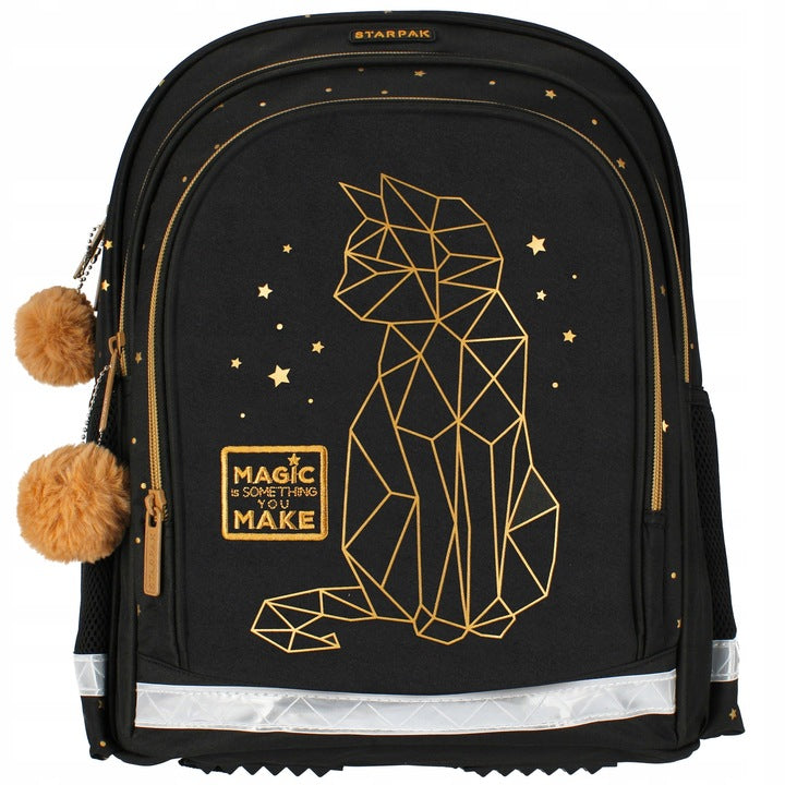 Mokyklinė kuprinė-portfelis mergaitei, juoda su auksiniu katinu – pagrindinis vaizdas