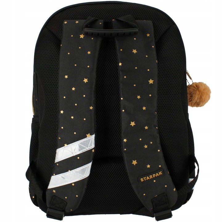 Mokyklinė kuprinė-portfelis mergaitei, juoda su auksiniu katinu – vaizdas 2