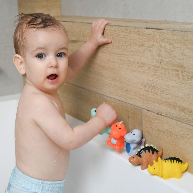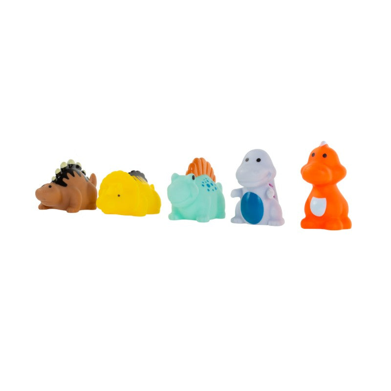 5 spalvingų Dinozaurų komandos vonios žaislų rinkinys. Unikalus ir unikalus dizainas. Ryškios spalvos patraukia mažųjų dėmesį.