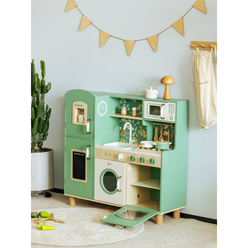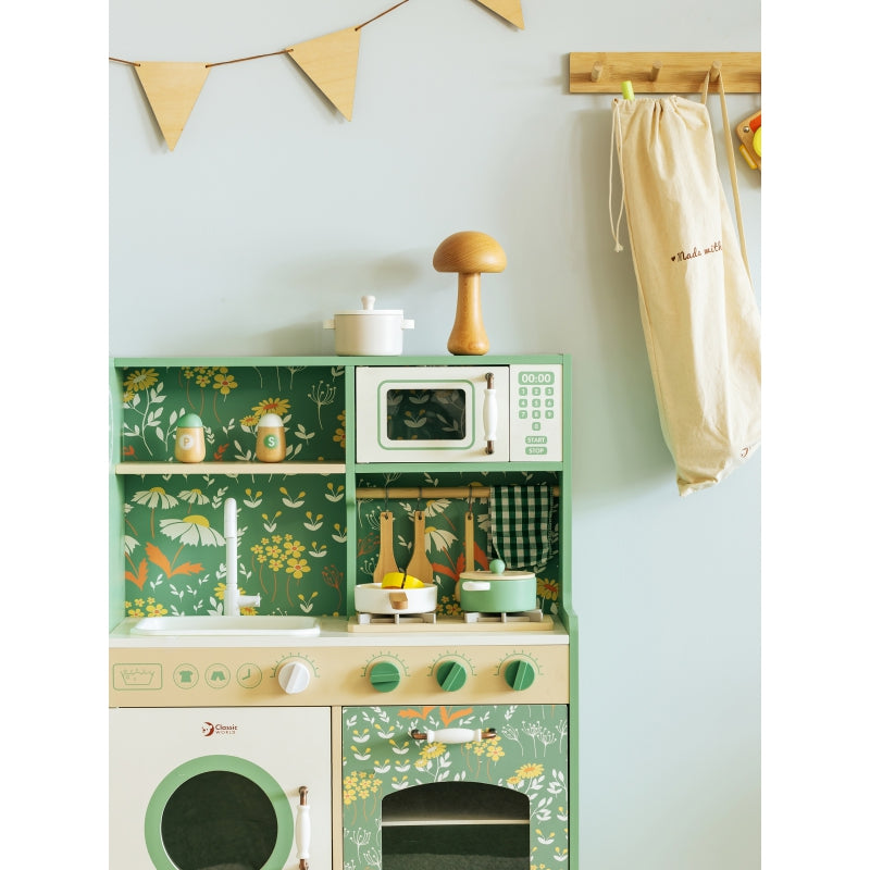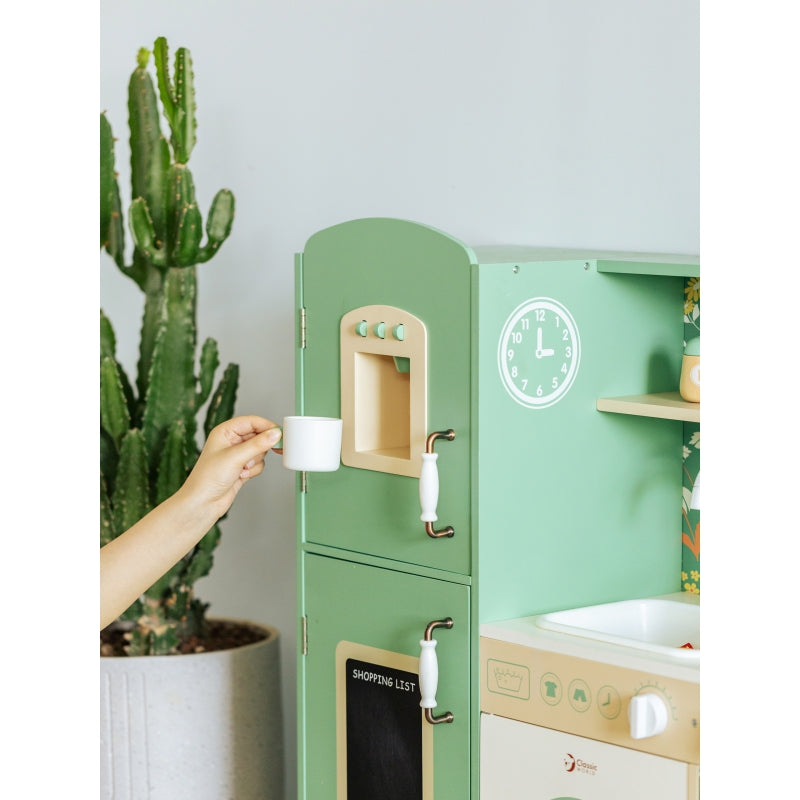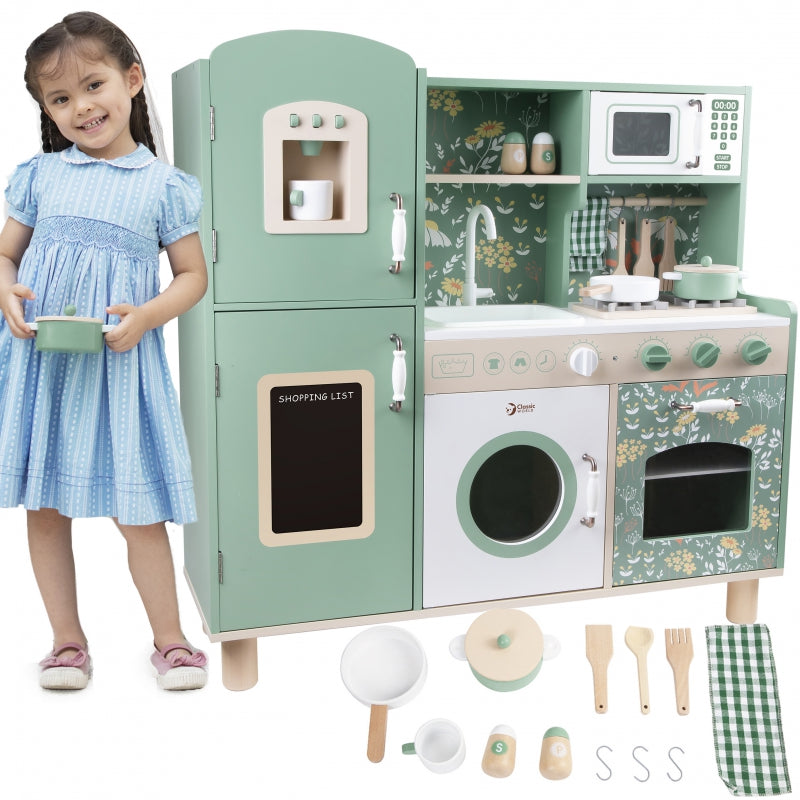 Graži virtuvė iš prekės ženklo CLASSIC WORLD yra puikus pasirinkimas vaikams, kurie mėgsta atlikti įvairius kasdieniame gyvenime stebimus suaugusiųjų vaidmenis. Ši medinė žaidimų virtuvė dažniausiai yra žalia su gražiais gėlių raštais, todėl vaikai gali mėgautis klasikinio stiliaus retro. Rinkinį sudaro daugybė funkcinių zonų, tokių kaip kriauklė, viryklė, spintelės ir indaplovė bei daug daugiau. Kairėje pusėje yra lenta, ant kurios vaikai gali rašyti. Ant viryklės galite imituoti gaminimą ir įgyti nuostabios kulinarinės patirties.