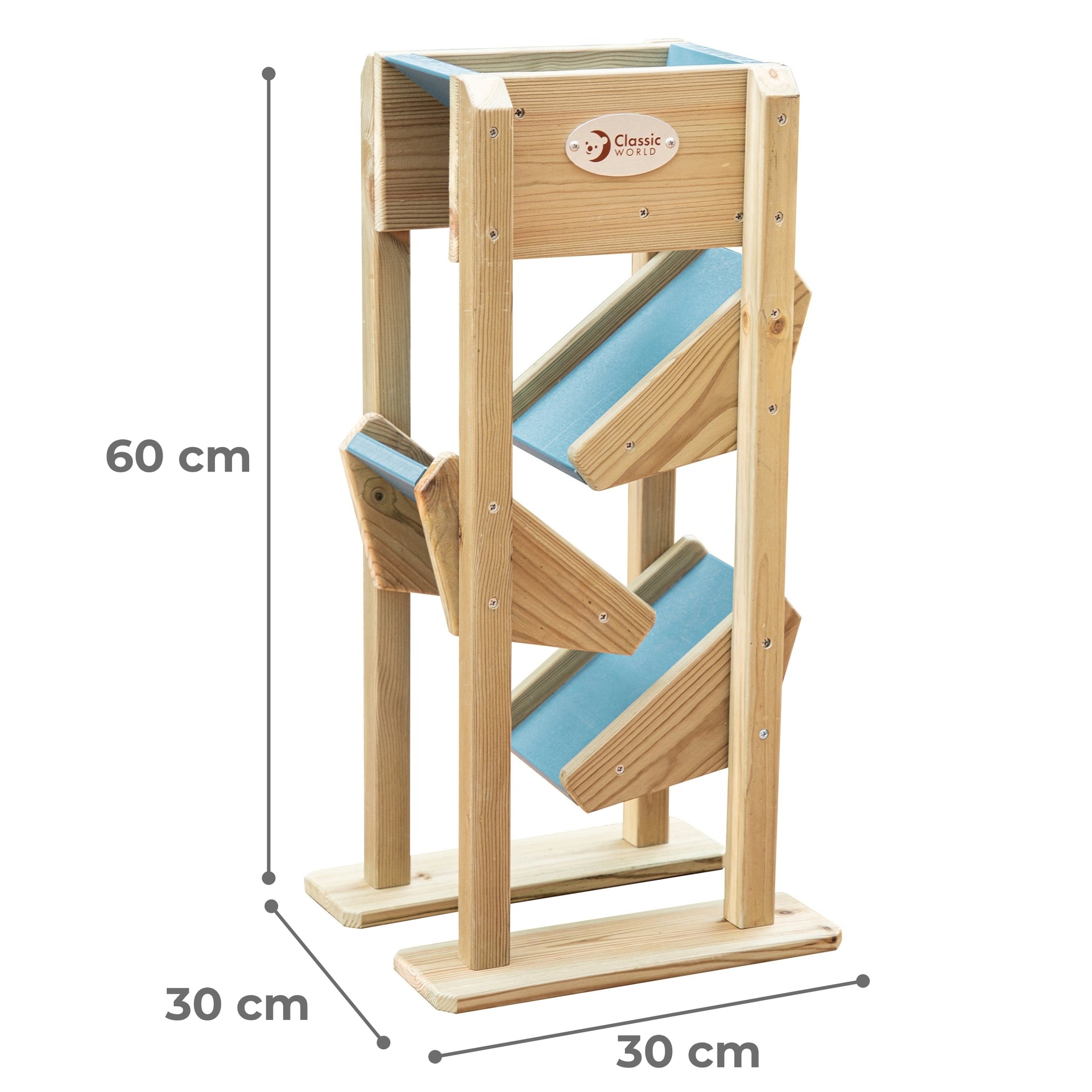 Ši aukštos kokybės „CLASSIC WORLD EDU“ medinė rampa su latakais sukurta tam, kad paverstų paprastą smėlio dėžę tikru nuotykių ir tyrinėjimo centru. Įpylus smėlio į viršuje esantį piltuvėlį, vaikai stebi, kaip smėlis krenta per tris skirtingus latakus. Tai puikus sensorinis žaislas, skirtas lavinti smulkiąją motoriką ir loginį mąstymą lauko žaidimų metu.
