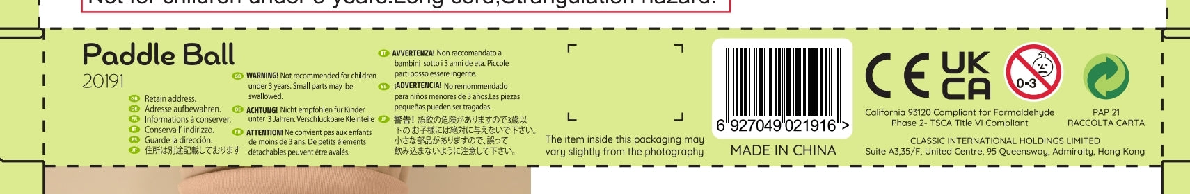 Šis „CLASSIC WORLD Paddle Ball“ miklumo žaidimas yra puiki klasikinė sportinė pramoga, skirta vaikams nuo 3 metų. Prie raketės pritvirtintas kamuoliukas su guma grįžta atgal po smūgio, todėl vaikas gali treniruotis be baimės jį pamesti. Tai idealus pasirinkimas aktyvioms pramogoms tiek viduje, tiek lauke.