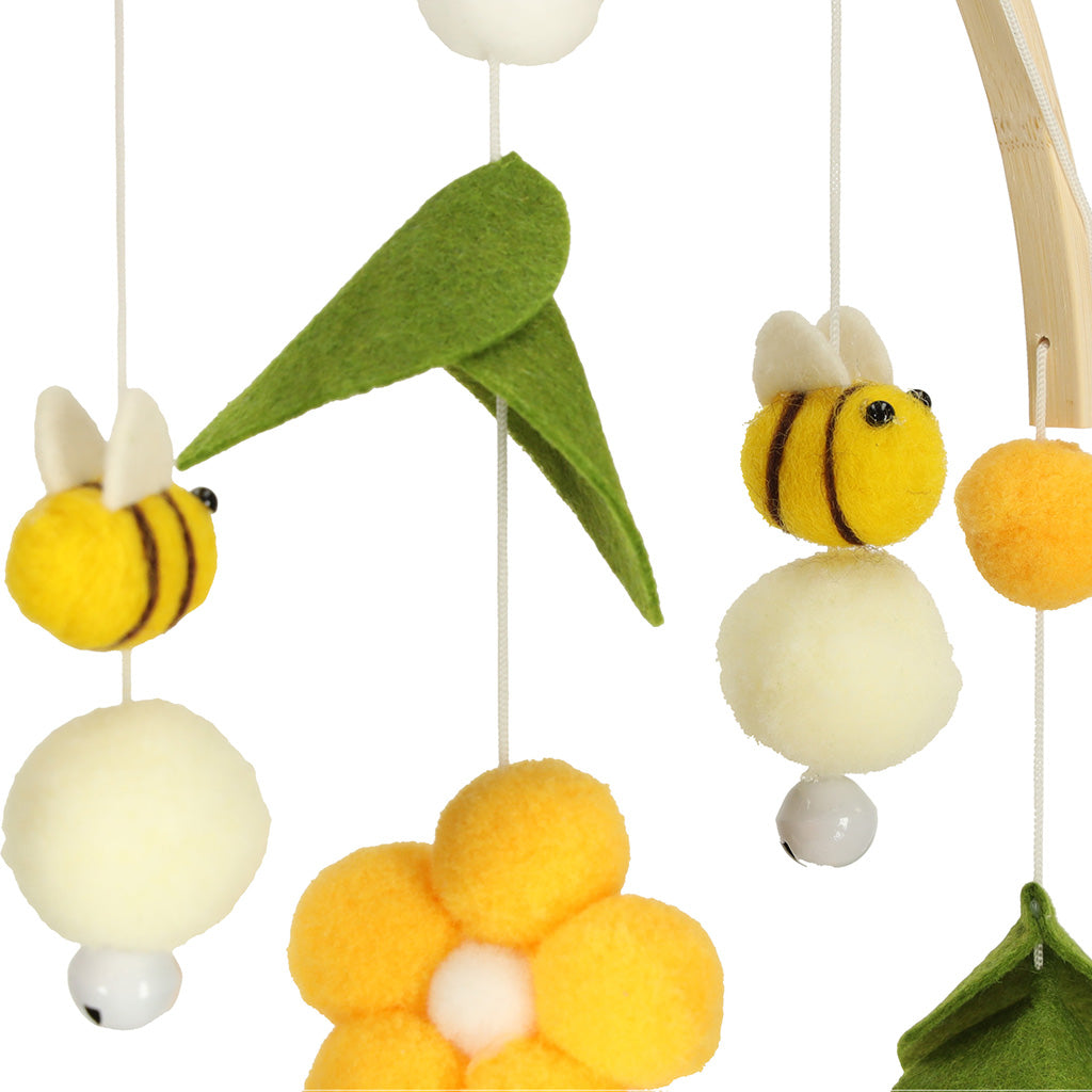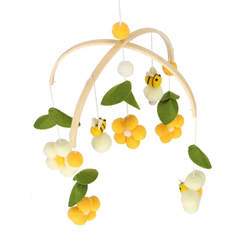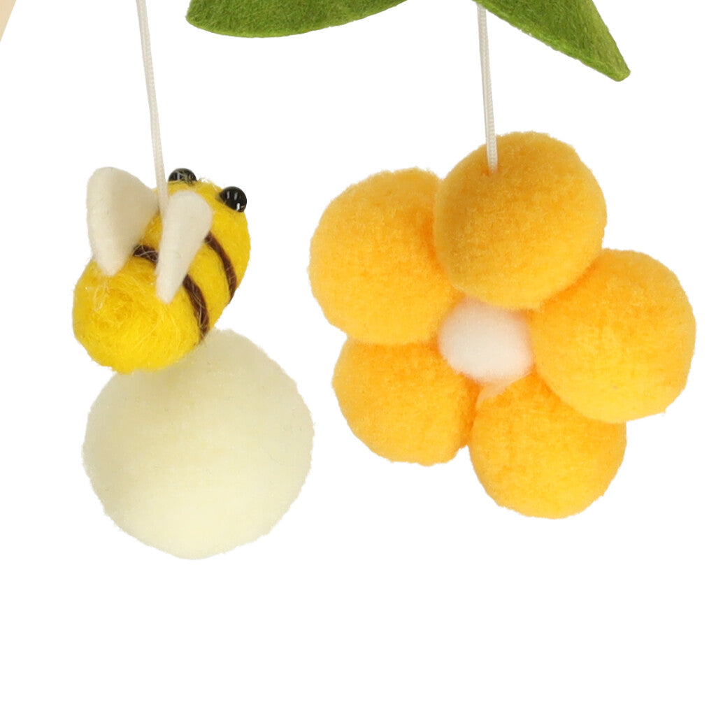 Medinė karuselė bus ne tik kūdikio žaislas, bet ir graži vaiko kambario puošmena. Geltonos gėlės ir bitės kartu su žaliais lapais įneš į interjerą spalvų pliūpsnį ir papildomai patrauks kūdikio dėmesį sodriomis spalvomis.